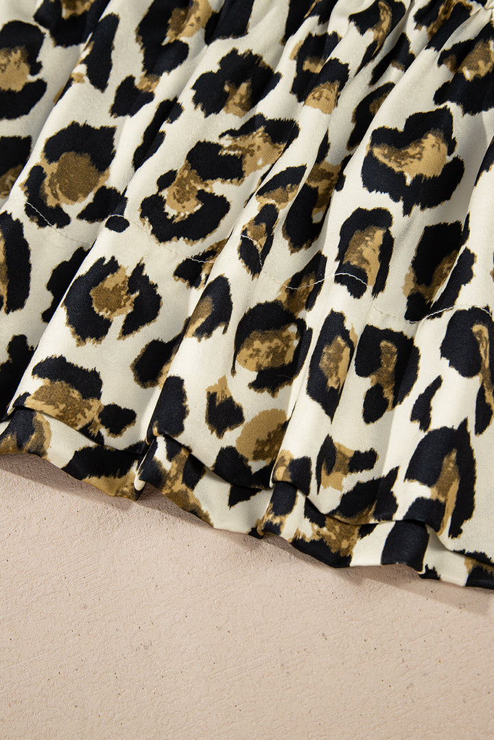 Apricot Leopard Bubble Sleeve Bow Tie Front Peplum Blouse