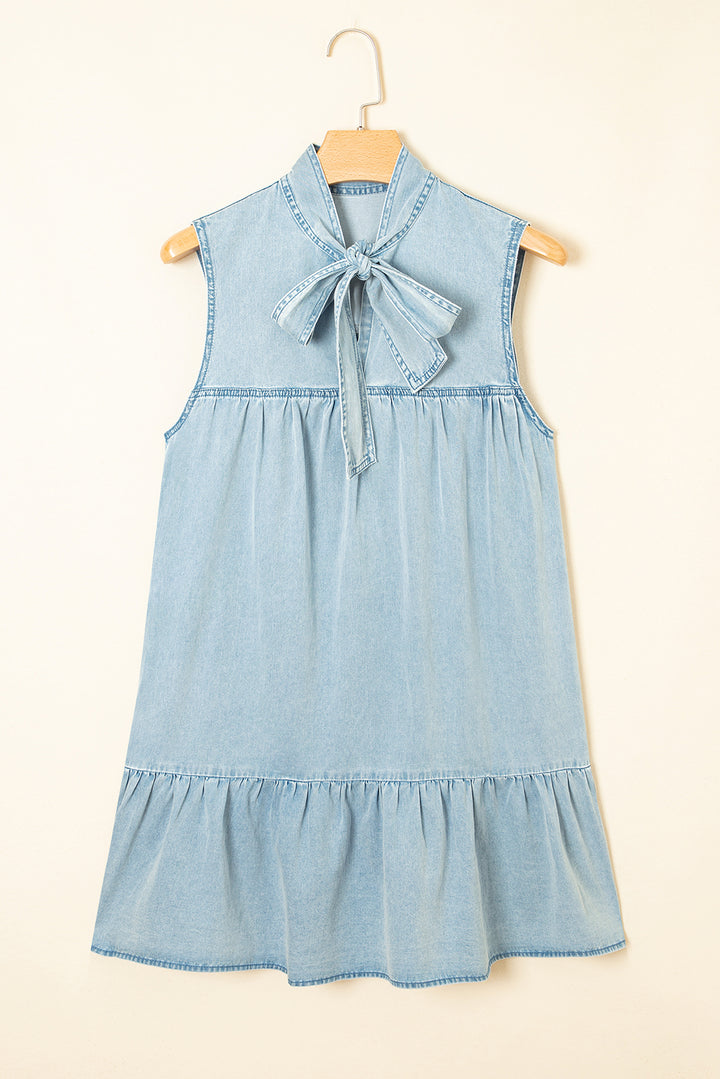 Beau Blue Bowknot Neck Sleeveless Ruffled Chambray Dress