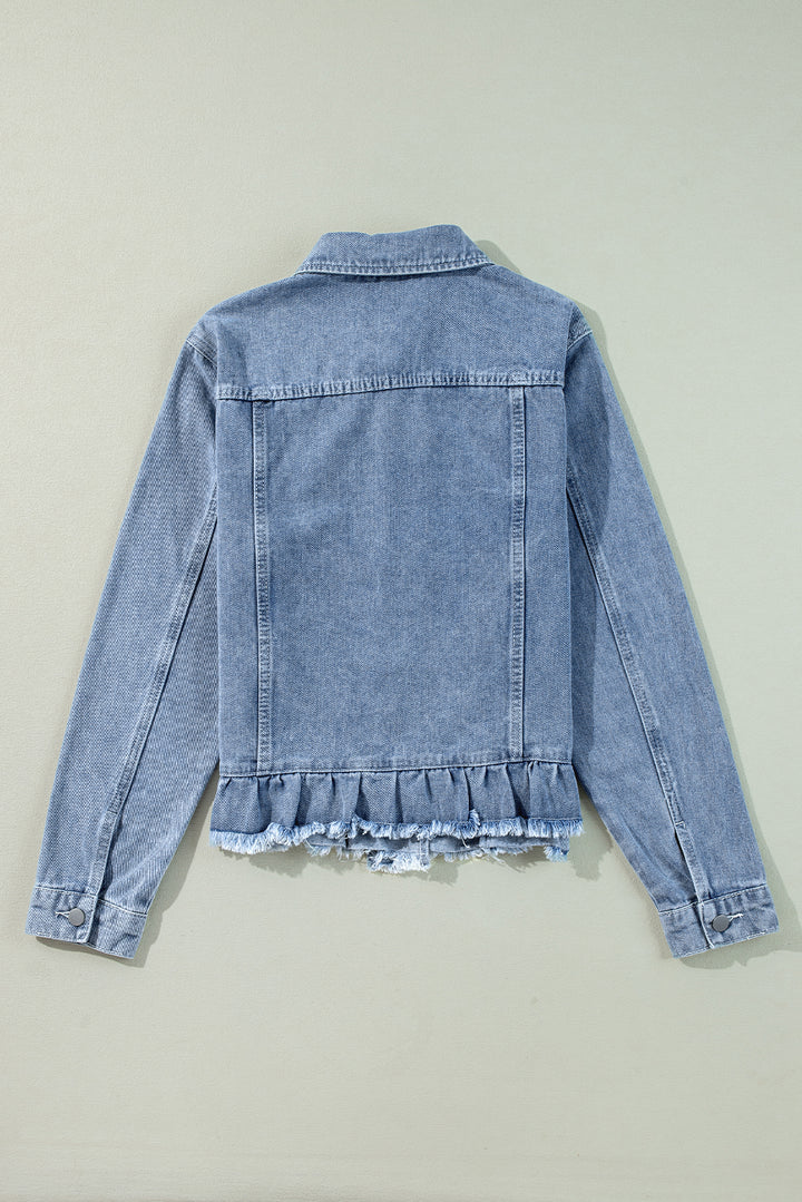 Beau Blue Ruffle Raw Hem Flap Pockets Denim Jacket