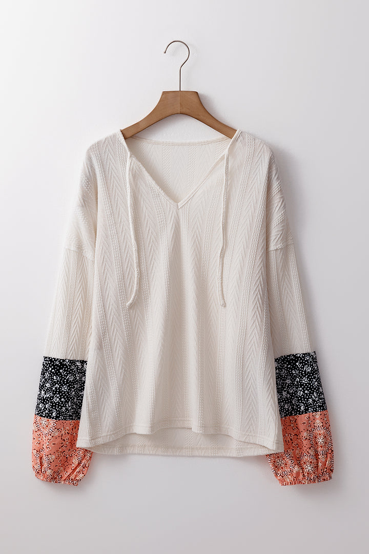 Floral Patchwork Textured Knit Drawstring V Neck Blouse