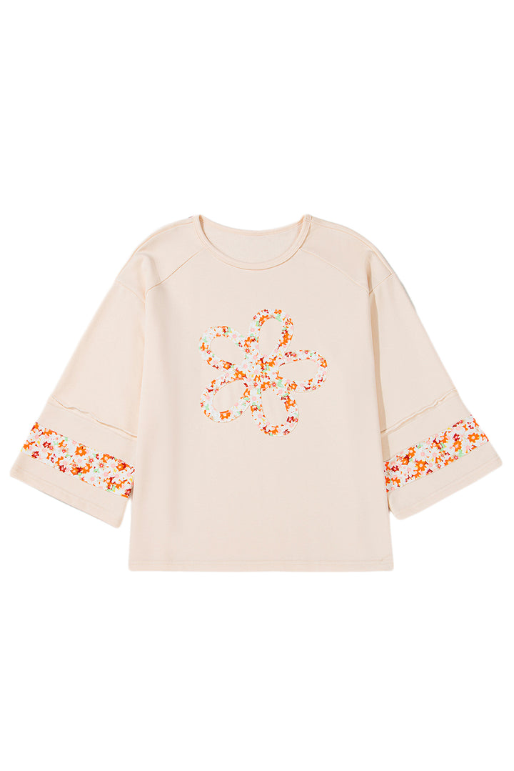 Plus Size Flower Patched Side Slits Crewneck Top