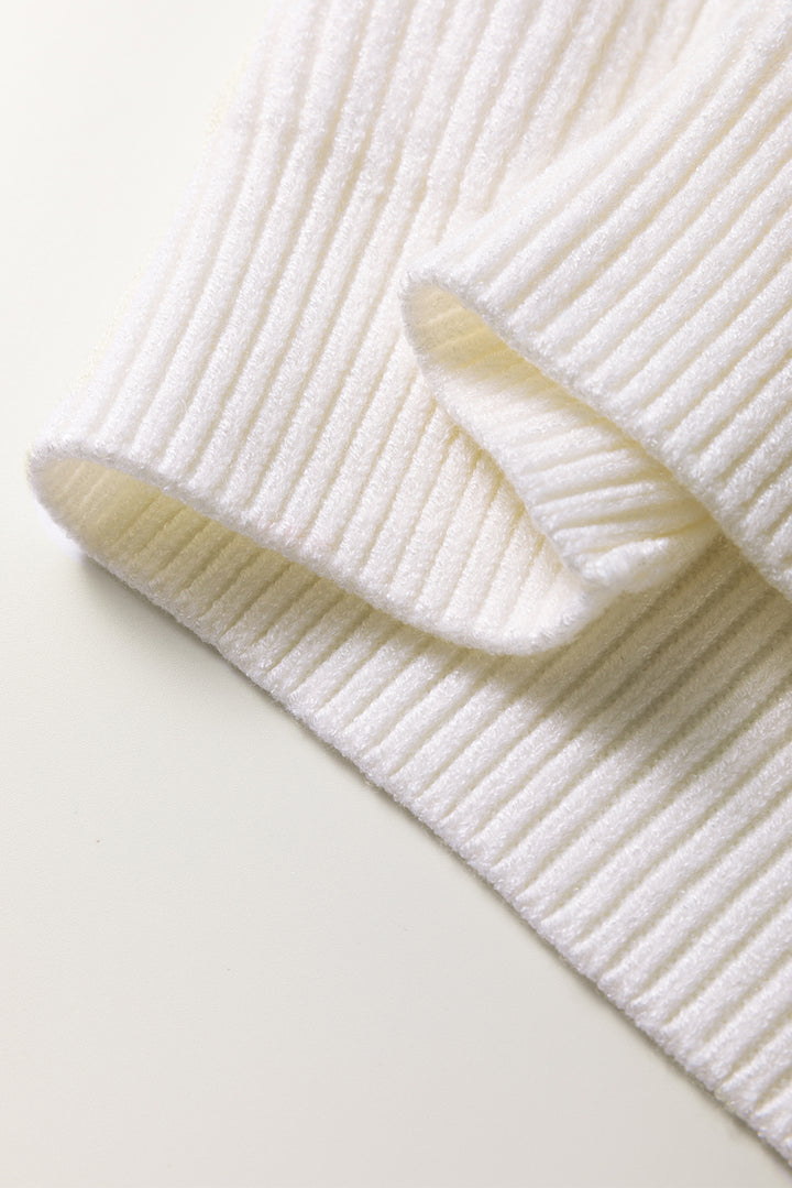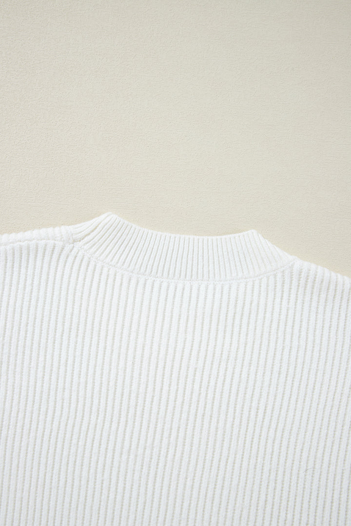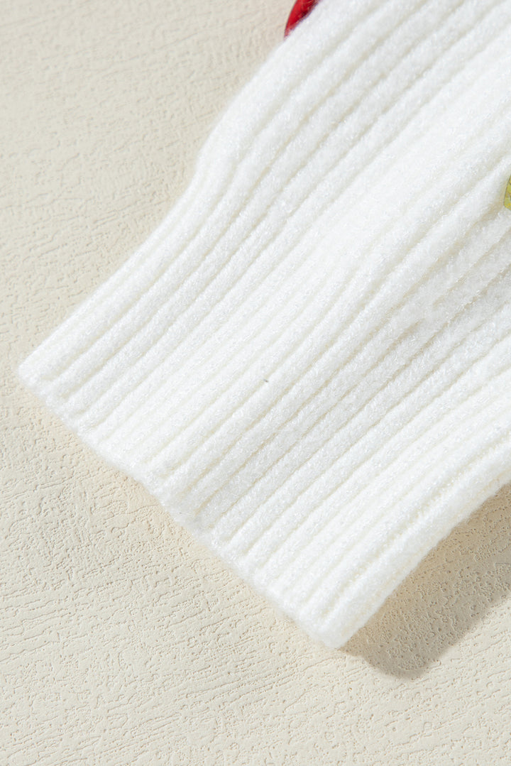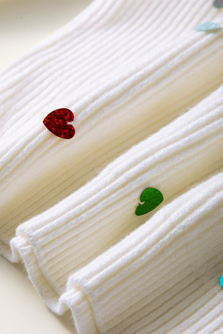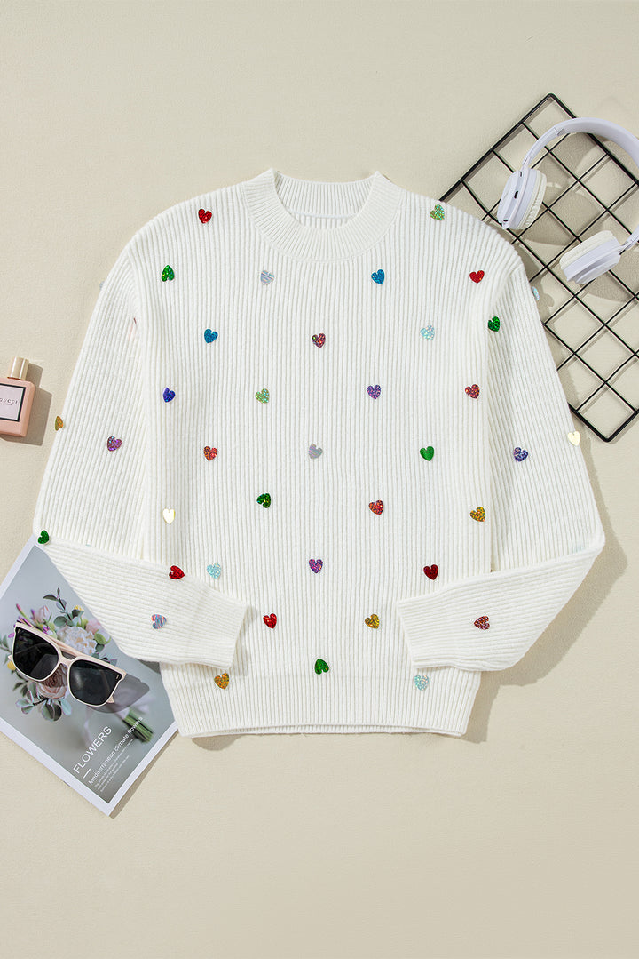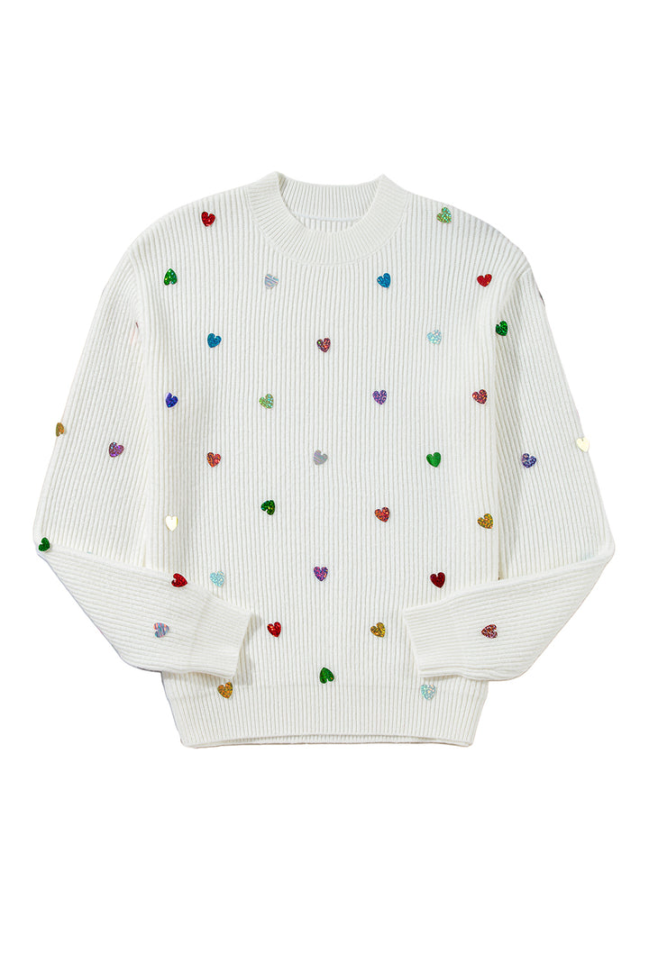 Sequin Heart Shape Waffle Knit Round Neck Sweater