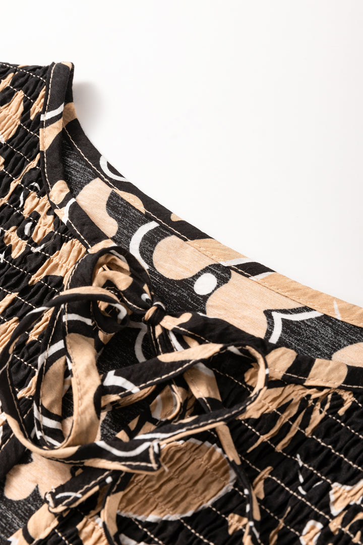 Black Floral Shirred Yoke Bracelet Sleeve Split Neck Boho Blouse