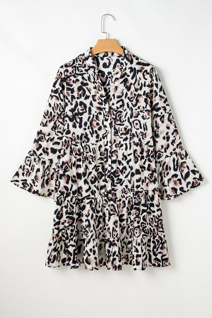 Leopard Print Buttoned Front 3/4 Sleeve Tiered Ruffled Hem Dress