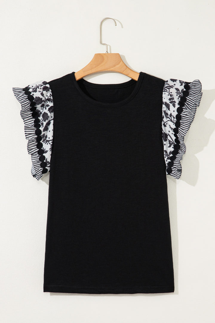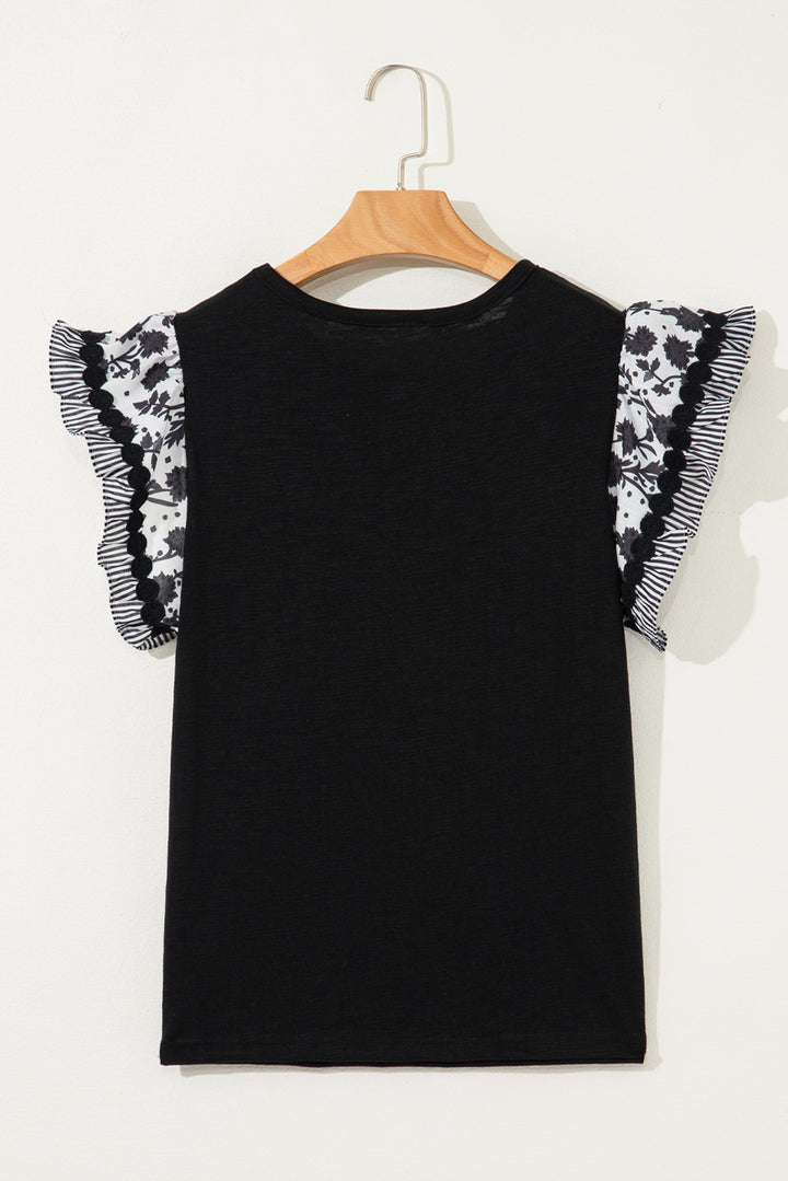 Black Ricrac Trim Printed Flutter Sleeve Contrast Patchwork Blouse