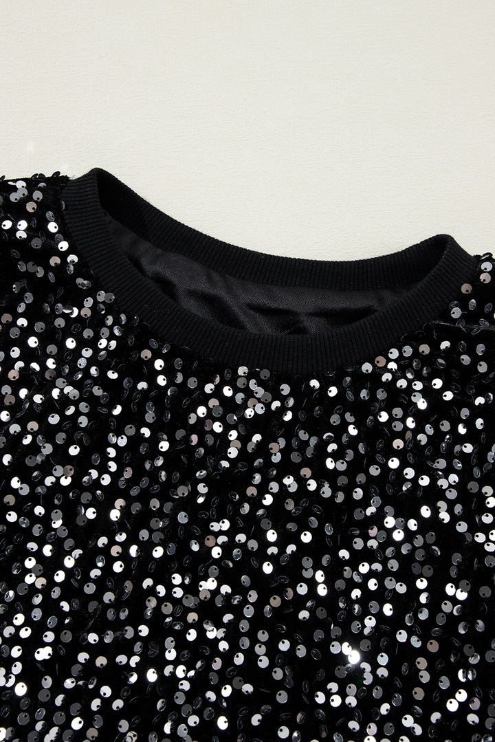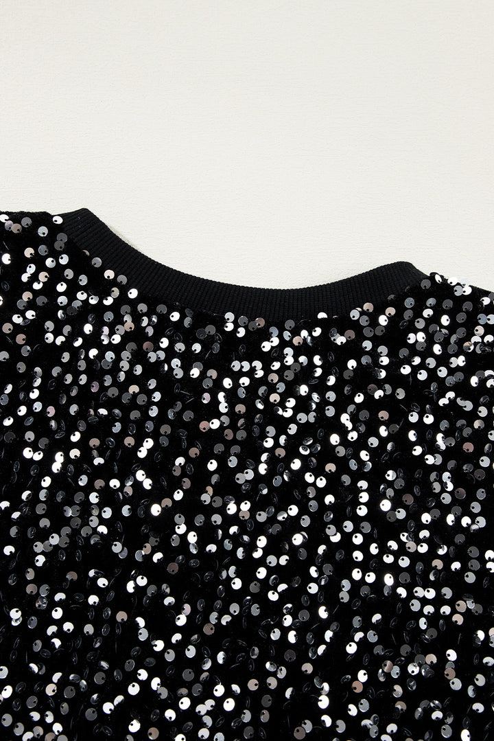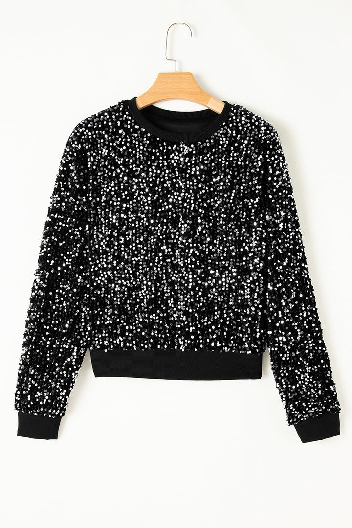 Sequined Long Sleeve Crew Neck Cropped Blouse