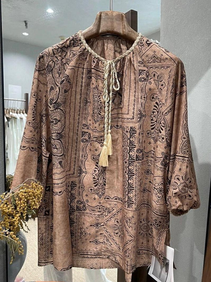 Boho Tassel Tie Neck Puff Sleeve Slit Blouse
