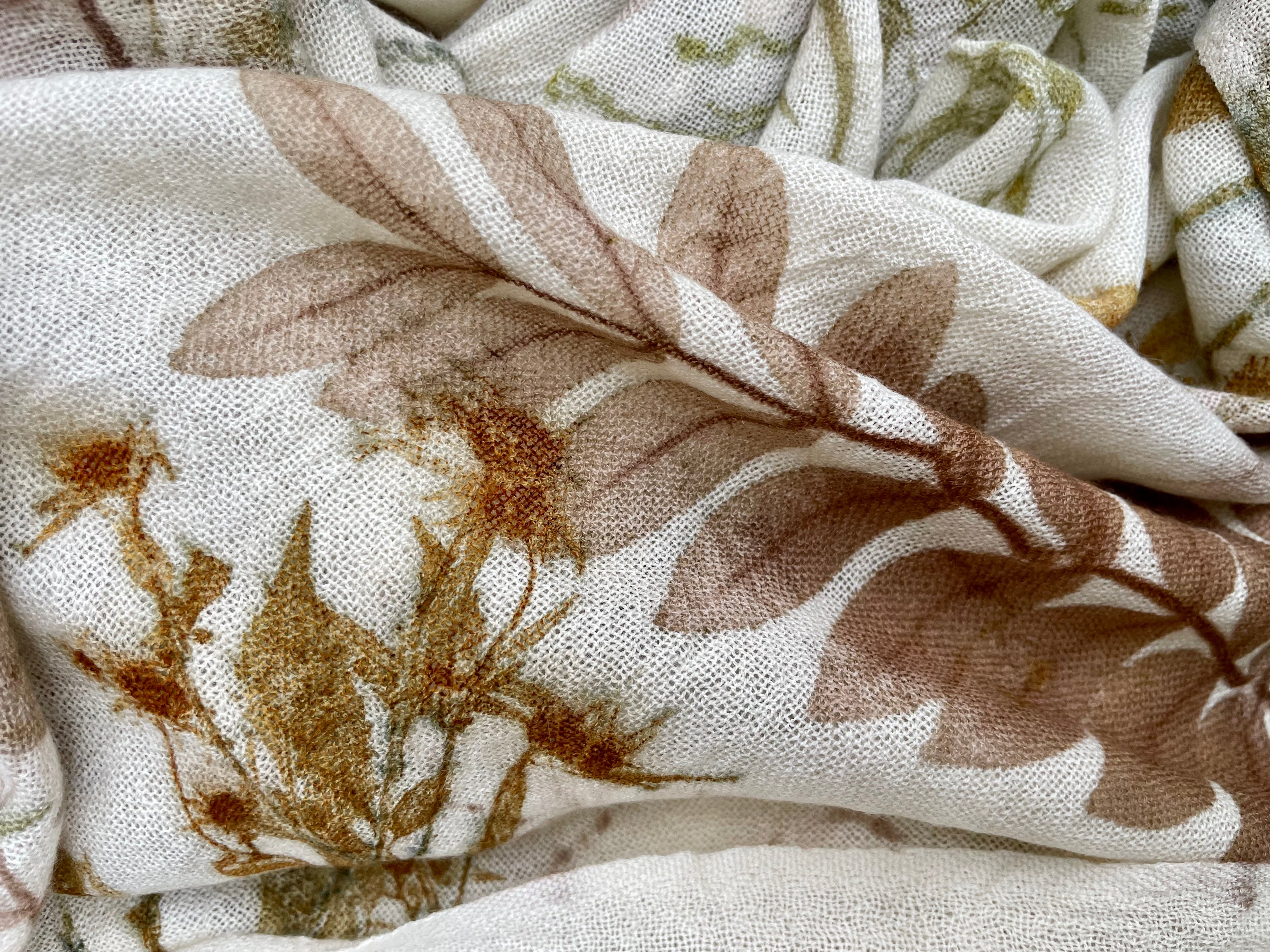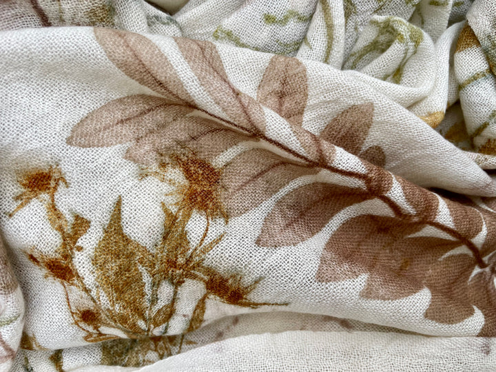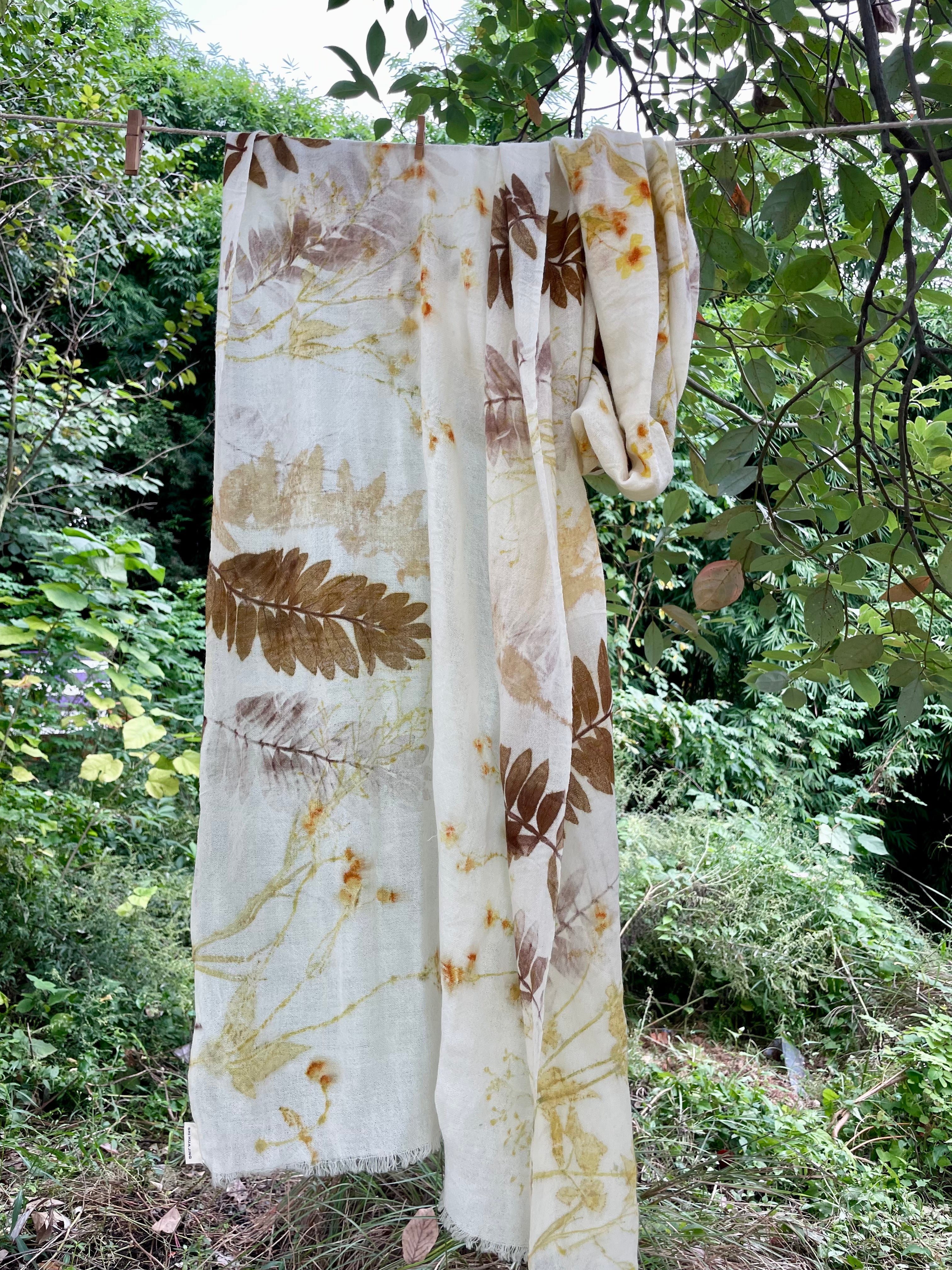 This scarf showcases exquisite botanical printing, with various leaves and tiny flowers transferred onto a light, cream-colored fabric. The prints feature a harmonious palette of earthy browns, soft greens, and subtle yellows, creating a natural and organic pattern. Hung outdoors amidst lush greenery, the scarf blends seamlessly with its surroundings, highlighting the beauty of nature-inspired textile art. Each leaf and flower impression is unique, making this scarf a wearable piece of art that embodies the tranquility and charm of the natural world.