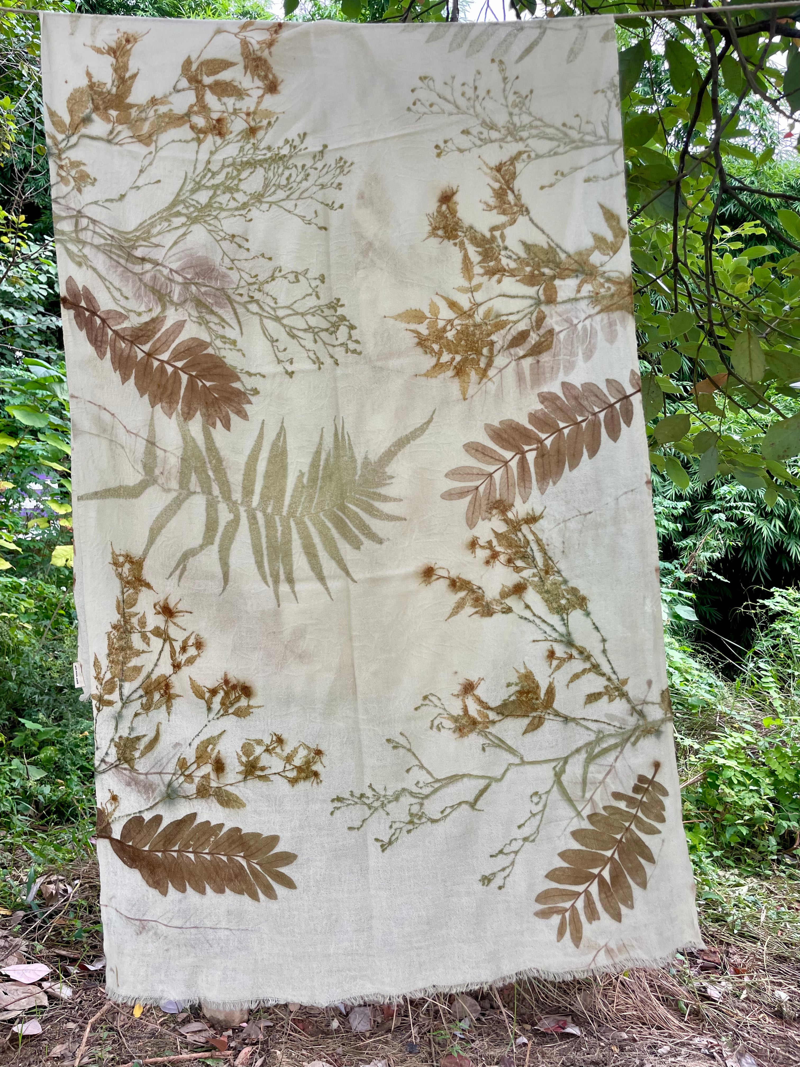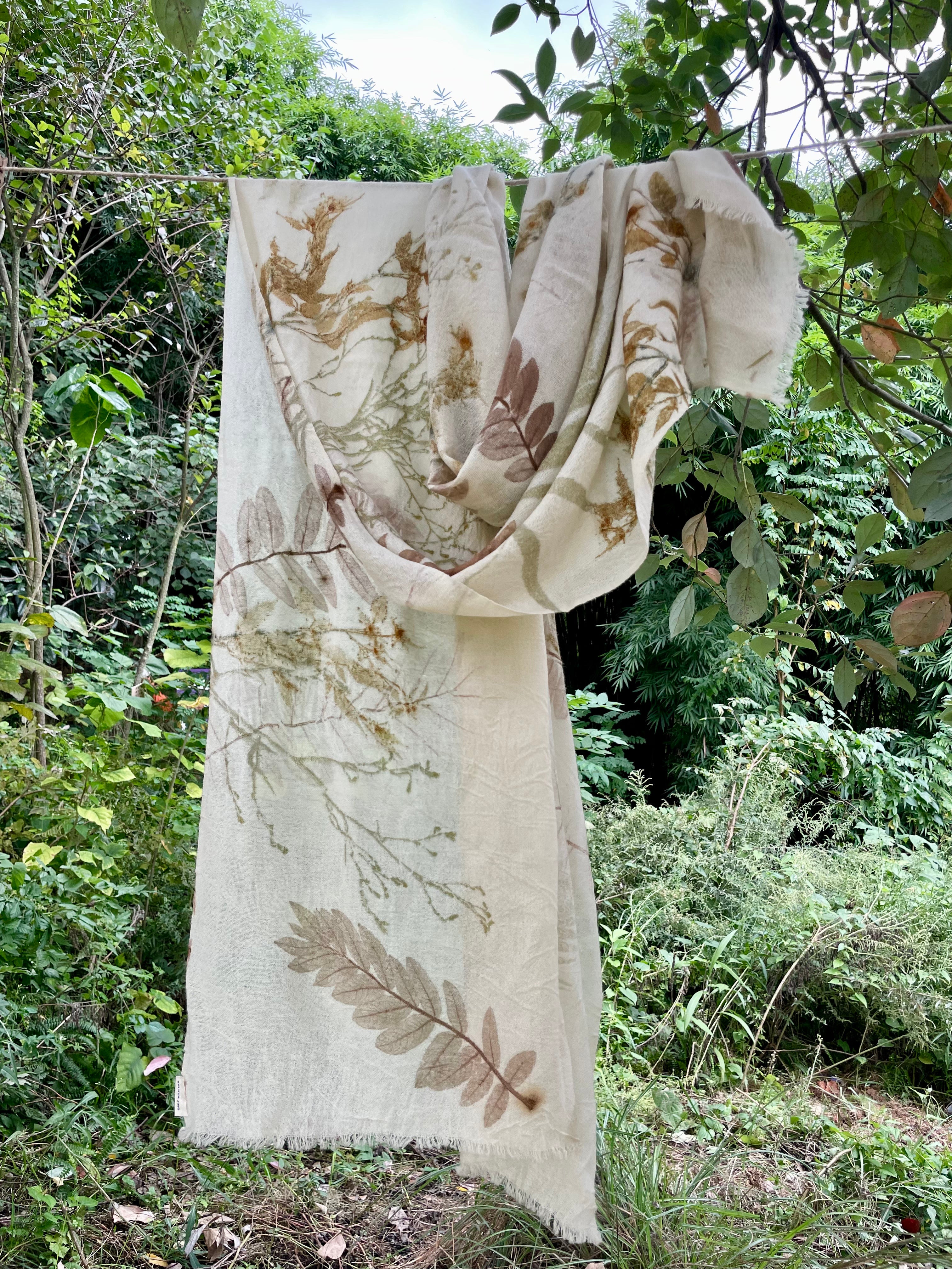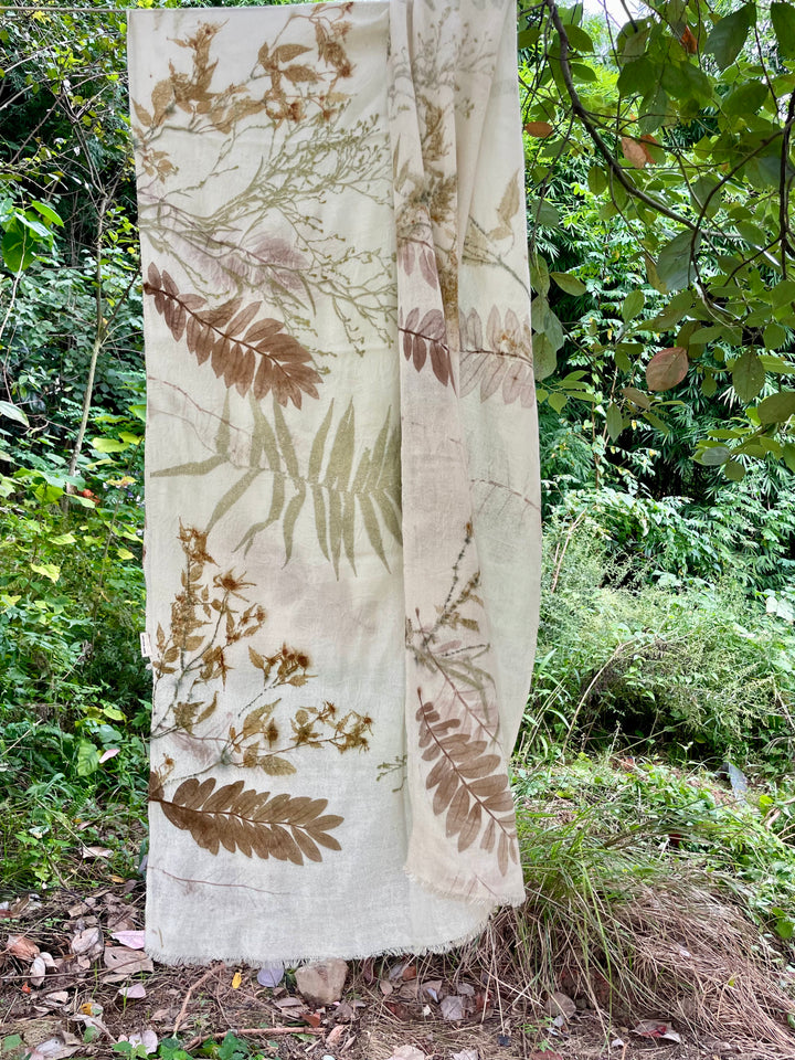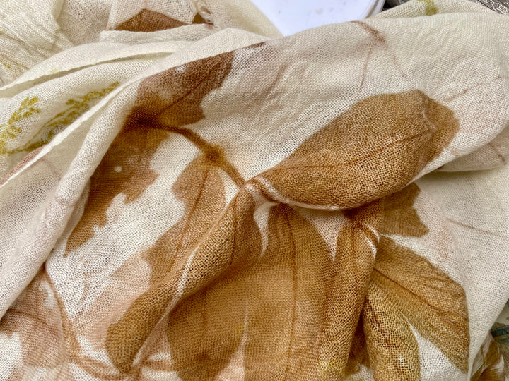 This Scarf showcases a rich botanical print, featuring an array of leaves, branches, and tiny floral elements in warm earthy tones of brown, beige, and subtle green. The light, cream-colored fabric serves as a canvas, highlighting the intricate details of each plant specimen—from the delicate veins of leaves to the fine structures of twigs.