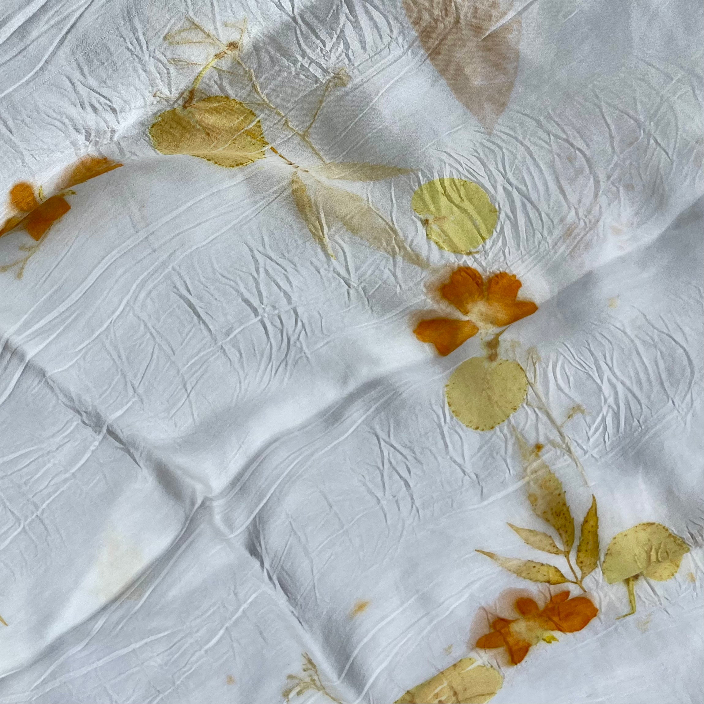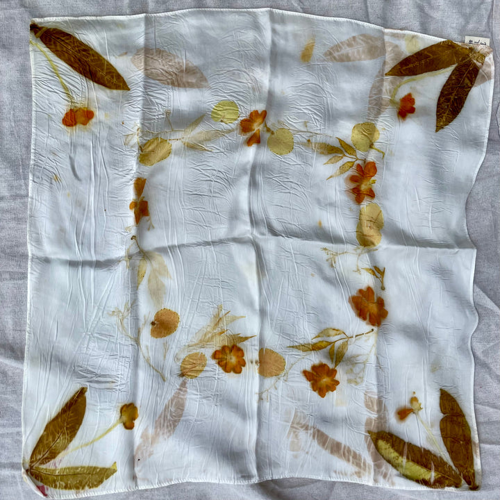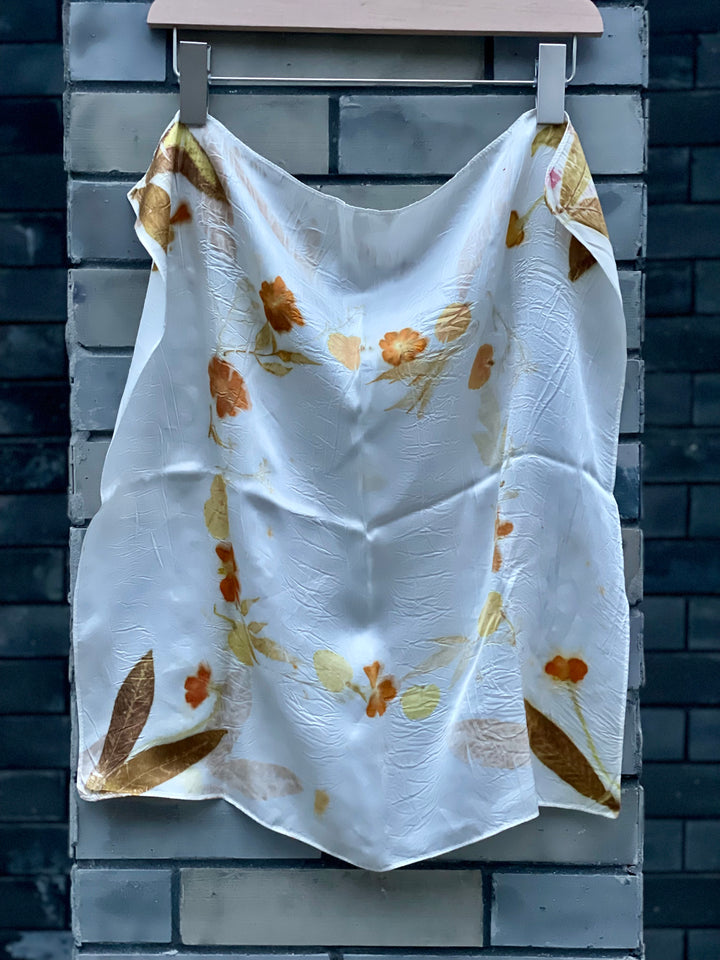 This silk square scarf boasts a charming botanical print, featuring vivid imprints of orange flowers and earthy brown leaves against a soft, cream-colored backdrop. The textured silk fabric accentuates the natural details, creating a balanced blend of organic beauty and refined craftsmanship. Laid out on a neutral surface, it highlights the scarf’s symmetrical pattern and unique, handcrafted aesthetic, making it a versatile piece that brings a touch of nature’s elegance to any outfit.