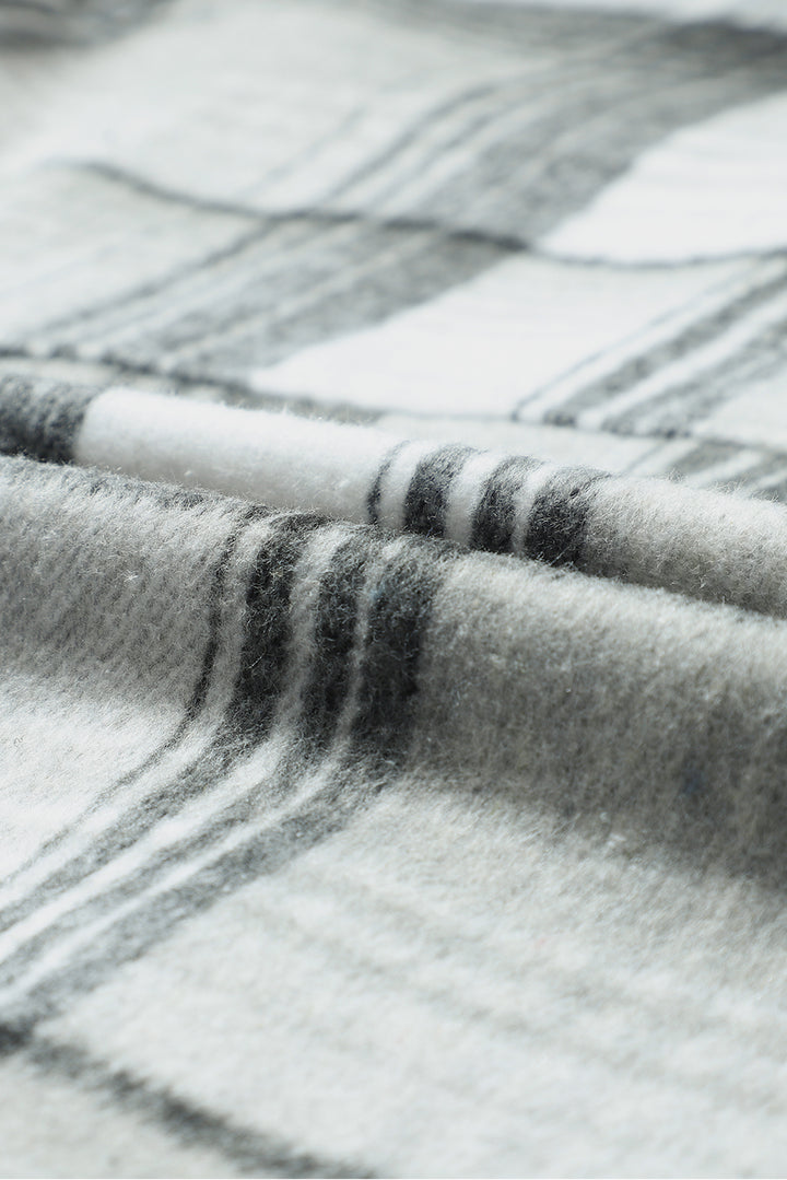 - An allover plaid print, front chest pockets, and tortoise buttons create a chic style