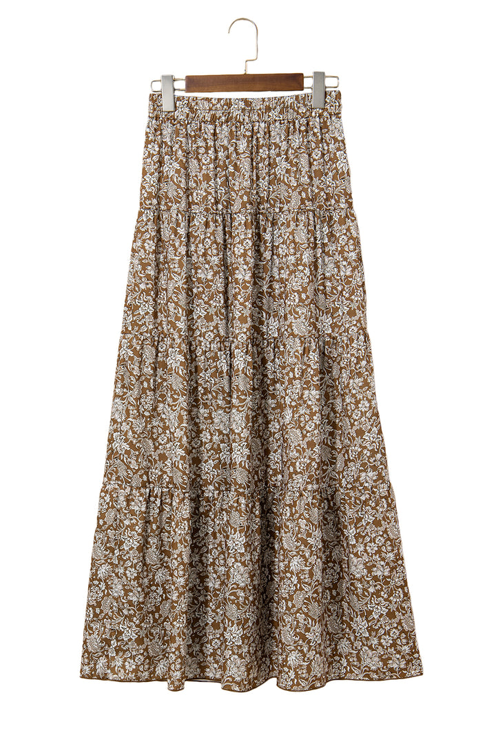 Brown Western Floral Print Ruffled Hem High Waist Loose Maxi Skirt