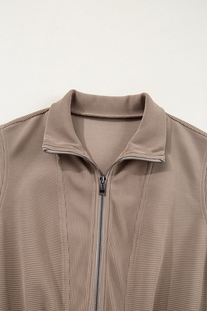 Dark Khaki Textured Short Sleeve Half Zip Drawstring Waist Romper