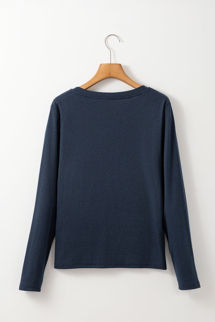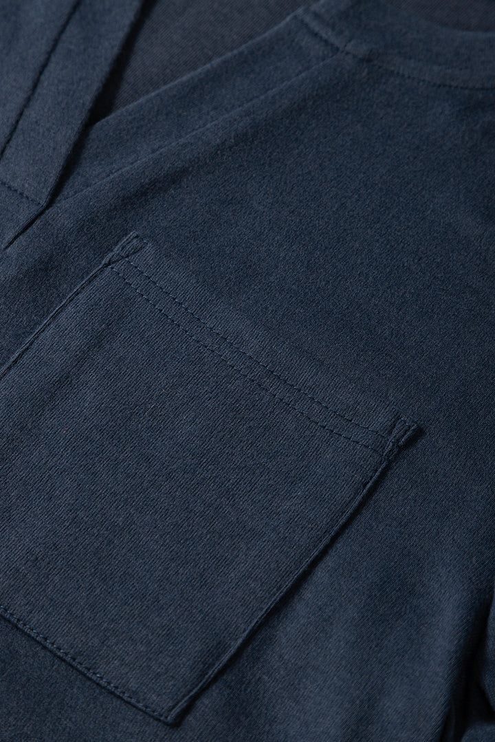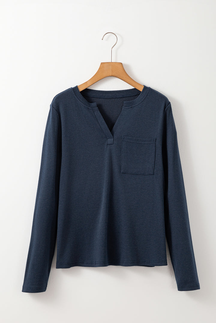 Dirty blue Notch V Neck Pocket Patched Long Sleeve T Shirt