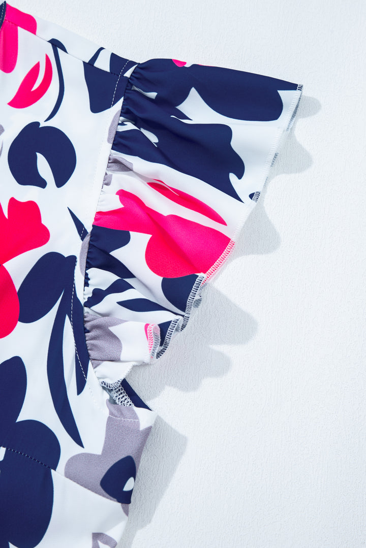 Fashion Floral Print Notched Neck Flutter Sleeve Mini Dress