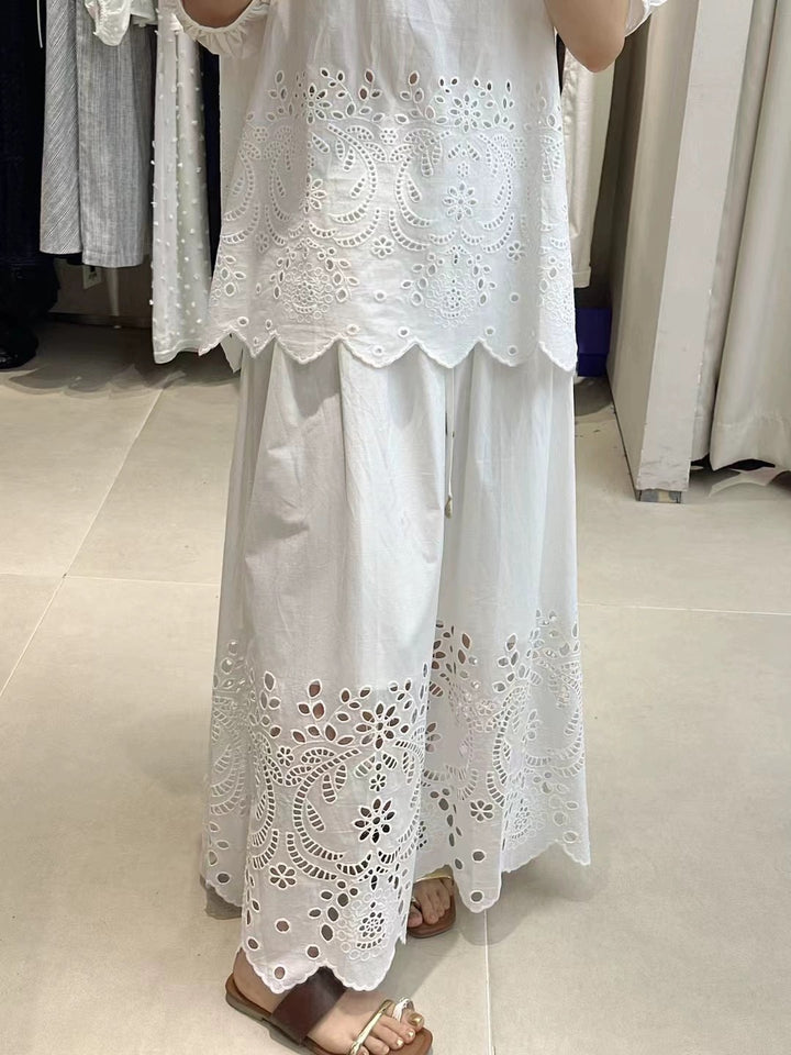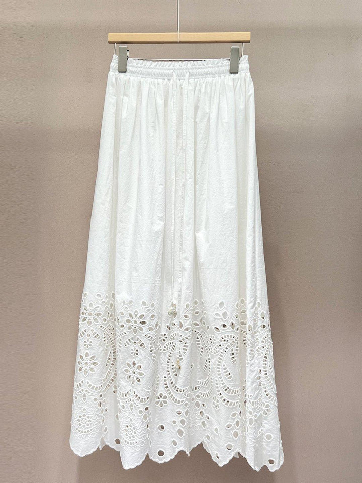 Floral Embroidered Hollow Drawstring Scallop Hem Skirt