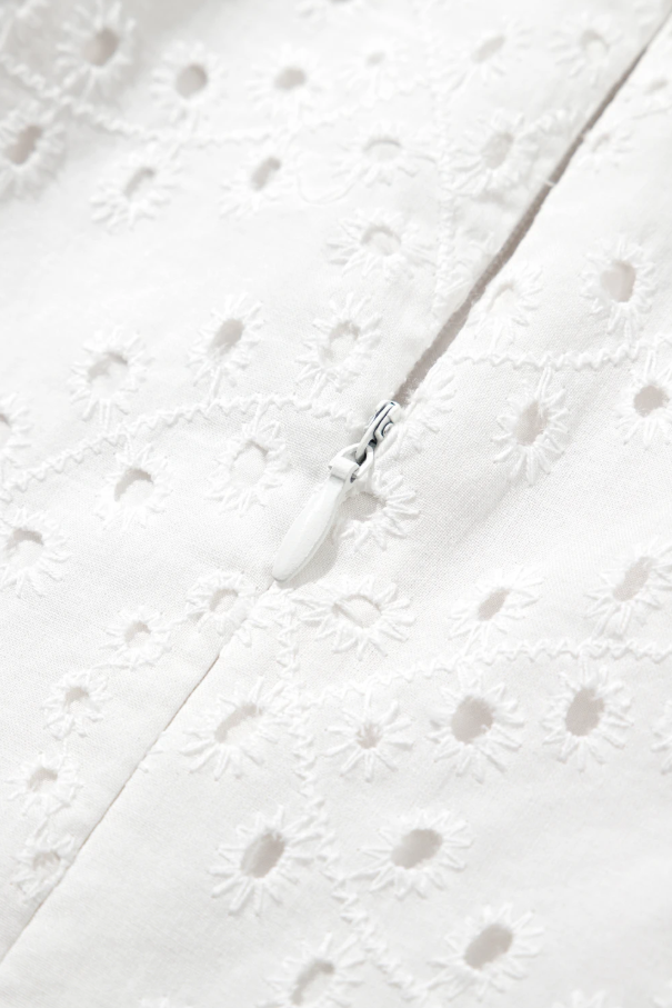 Floral embroidery adds a delicate touch to the mini dress. Eyelet details bring a classic and elegant look. Sleeveless design is perfect for warm-weather events. Shift silhouette flatters and offers a relaxed fit. |