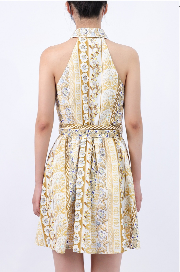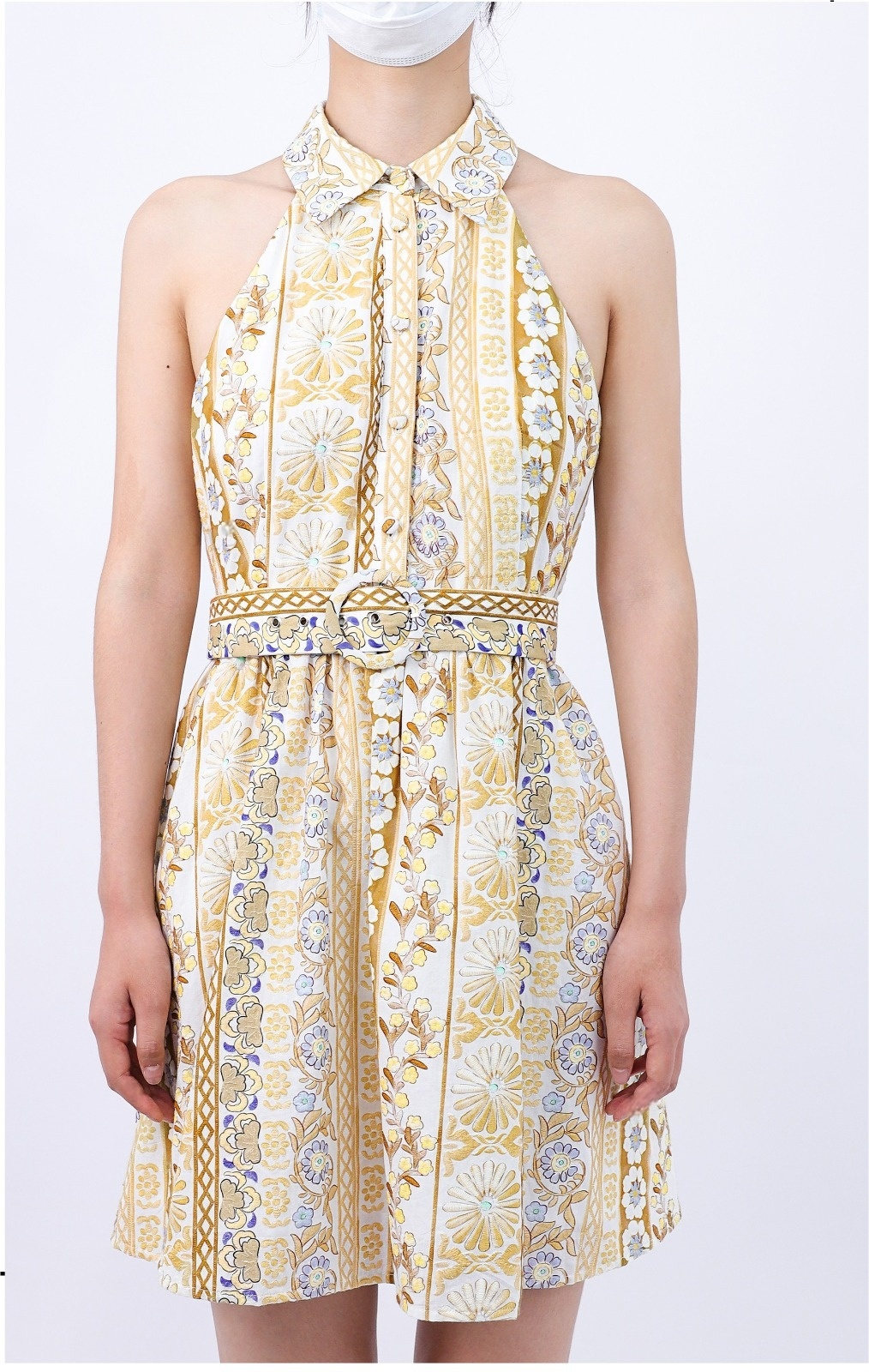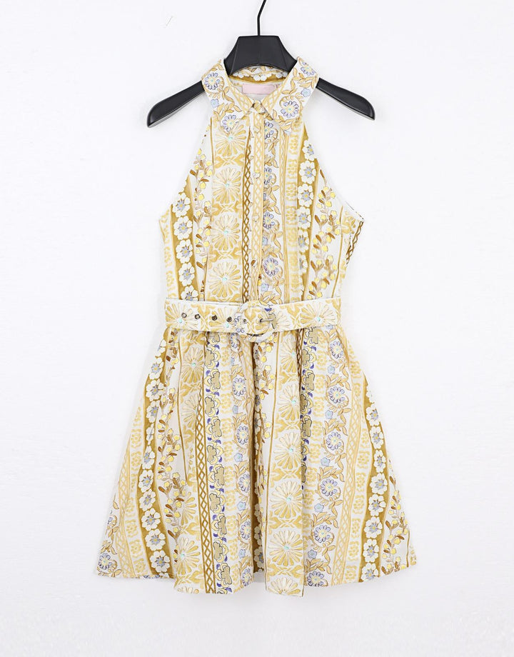 This women's mini dress features a charming yellow floral print, giving it a vibrant and lively look. It has a halter neck design that shows off the shoulders elegantly. A belt at the waist helps to accentuate the figure, creating a flattering silhouette. Perfect for summer outings, parties, or any occasion where you want to look stylish and feel comfortable, this dress combines fashion and ease.