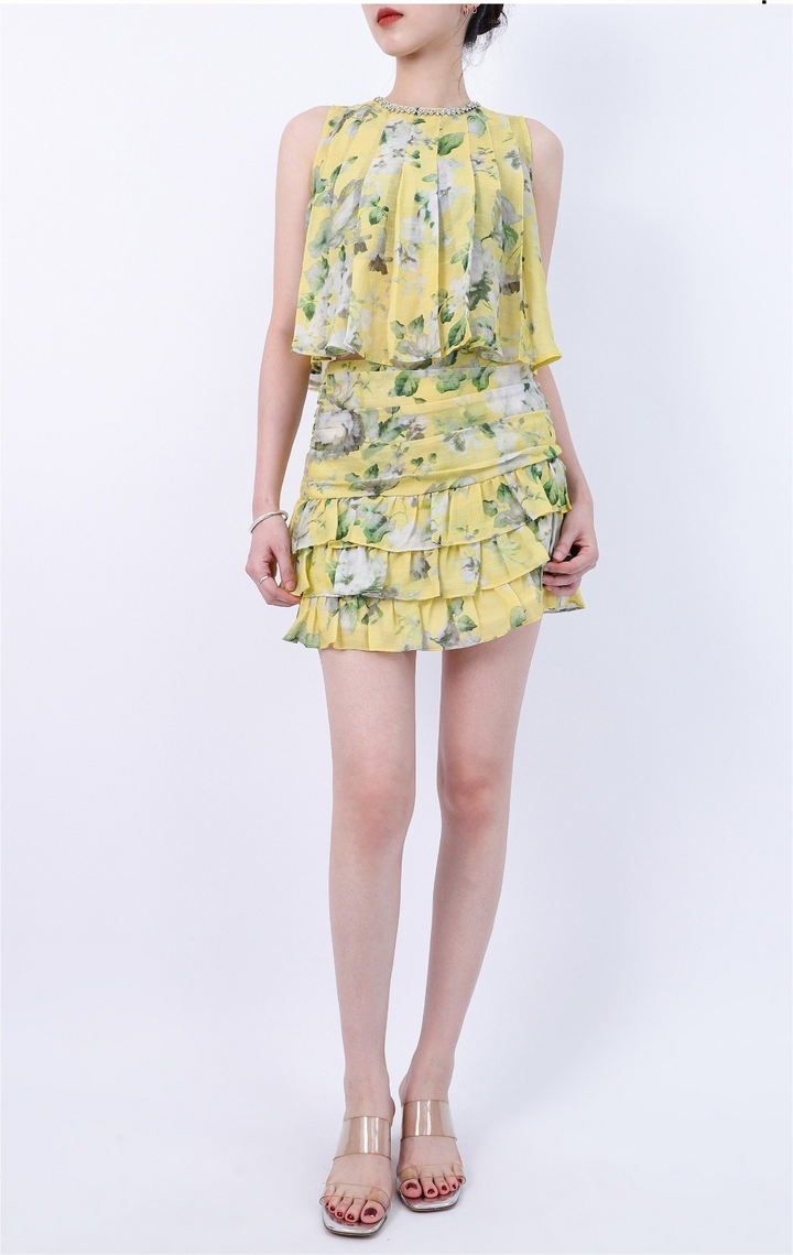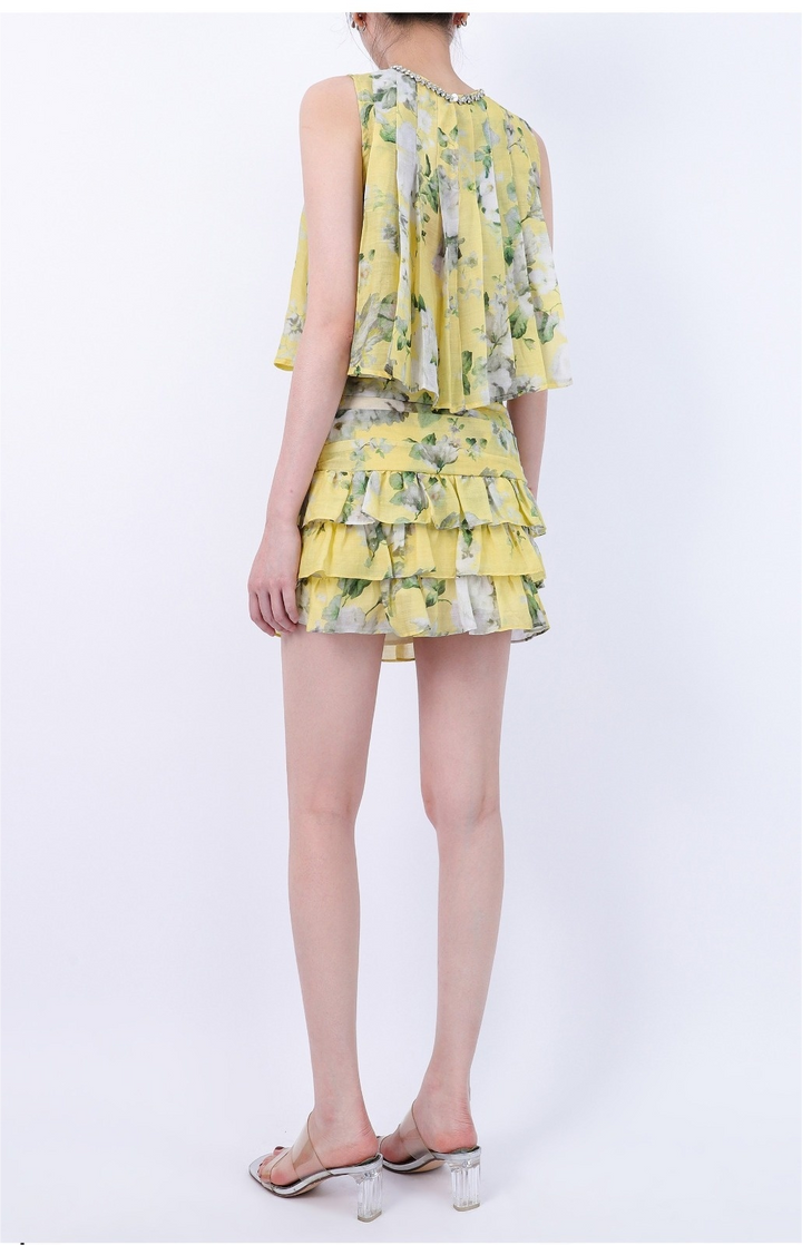 Floral Rhinestones Neck Trim Pleated Ruffle Crop Tank Top
