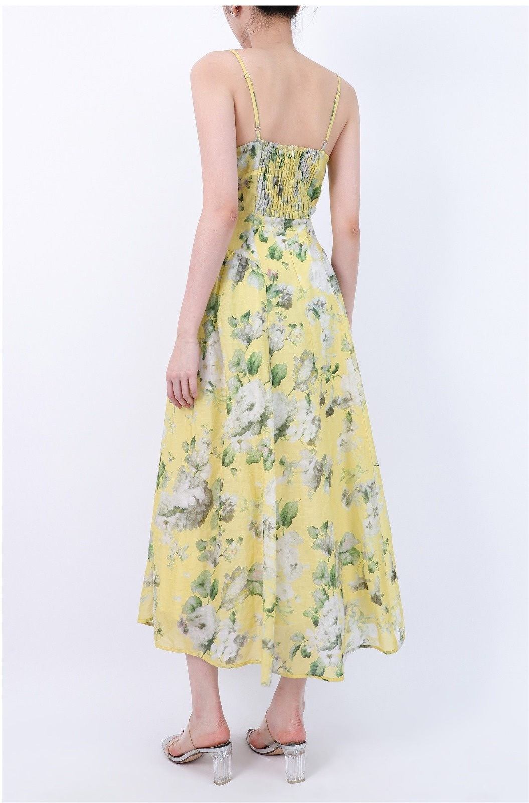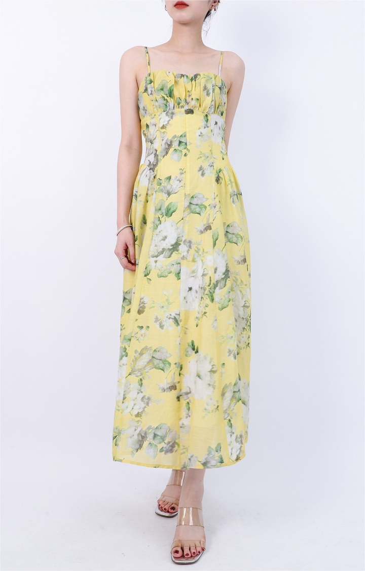 Floral Ruched Bust Fitted Waist Zipper Midi Cami Dress