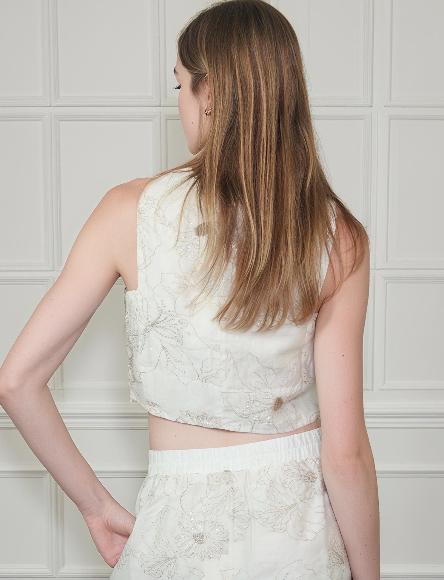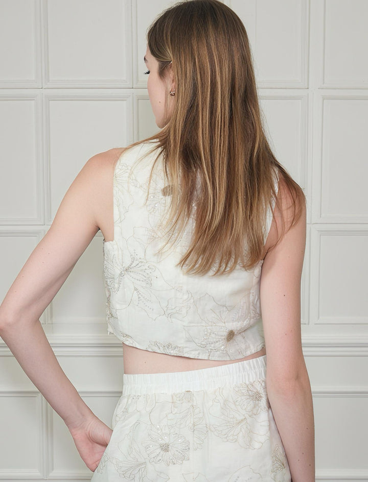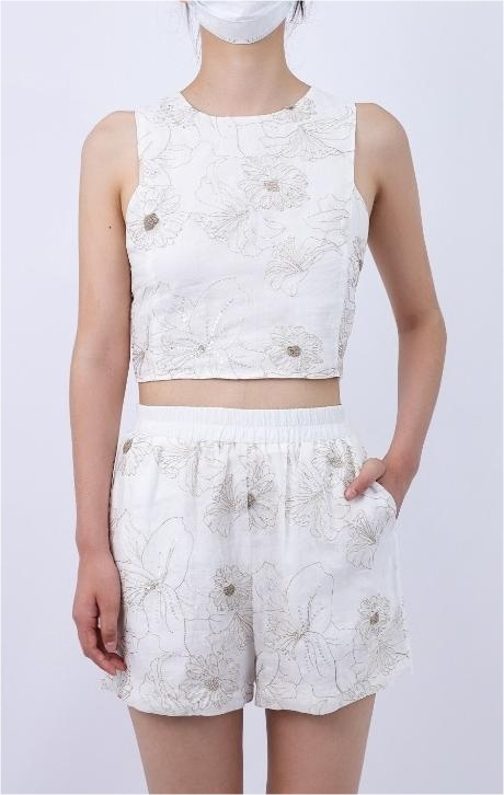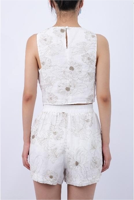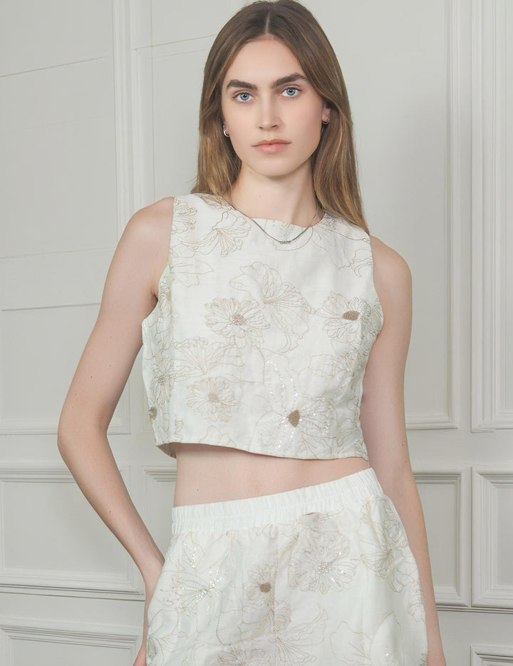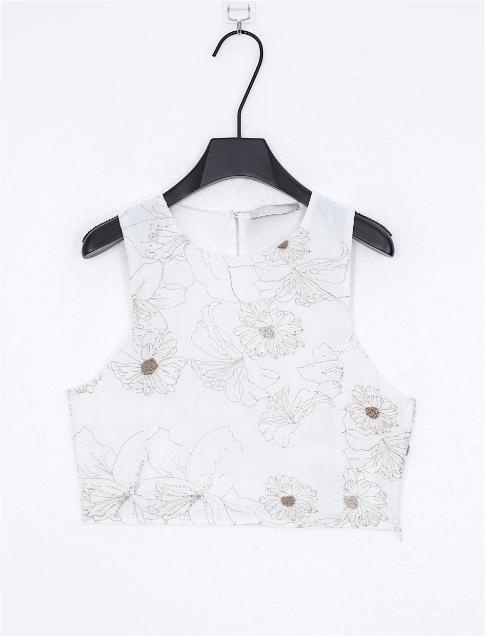 Floral Sequin Crew Neck Back Keyhole Crop Tank Top