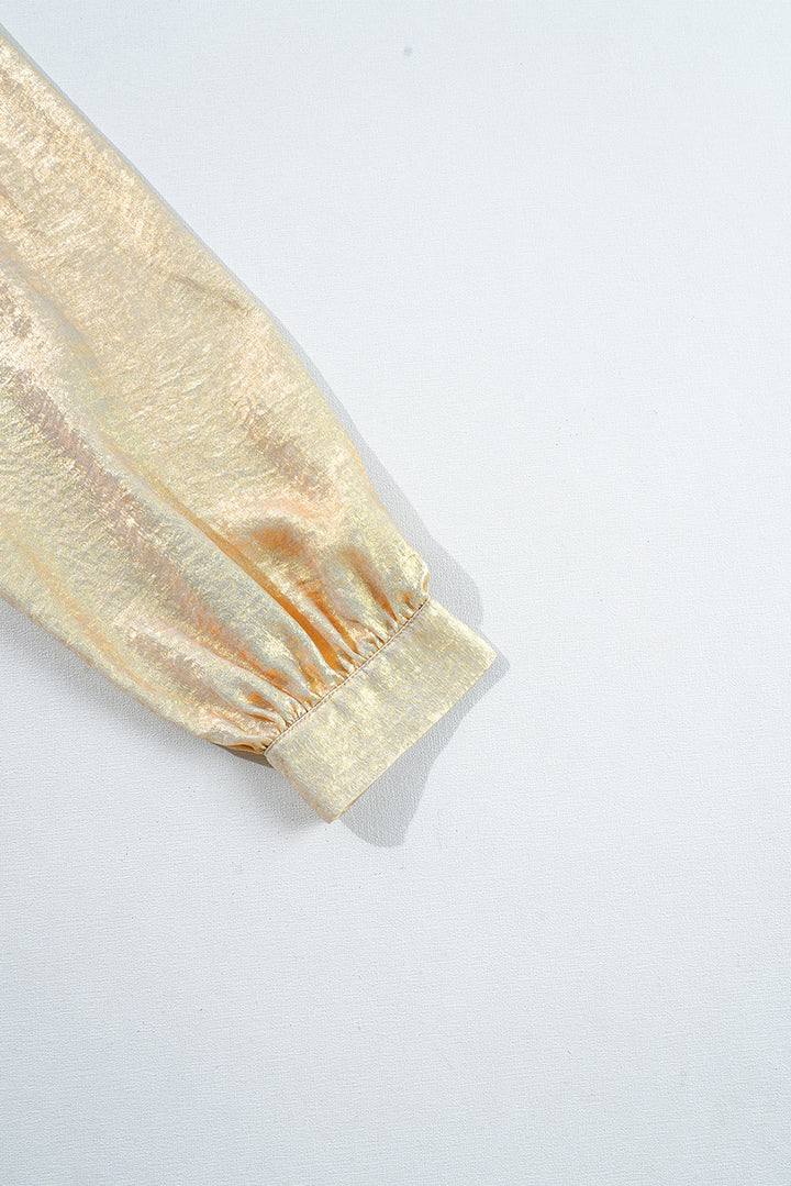 Gold Metallic Frilled V Neck Puff Sleeve Babydoll Blouse