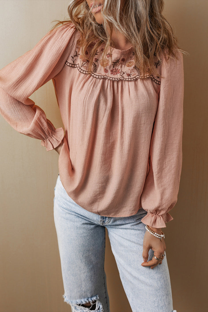Gossamer Pink Floral Embroidered Textured Flounce Sleeve Elegant Blouse