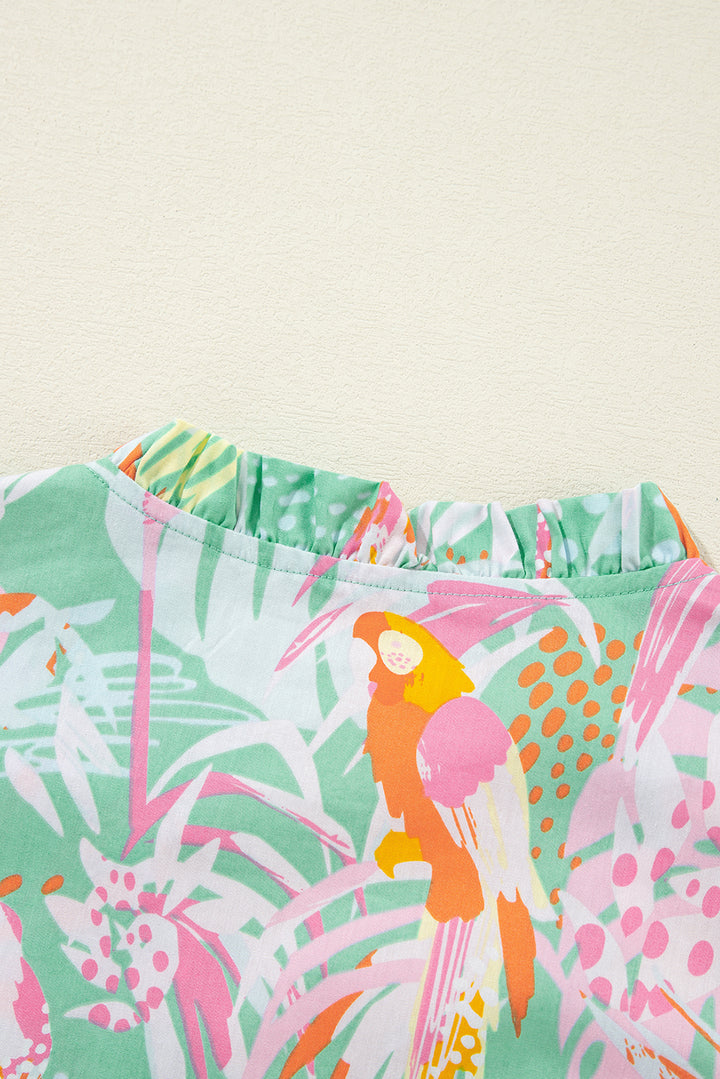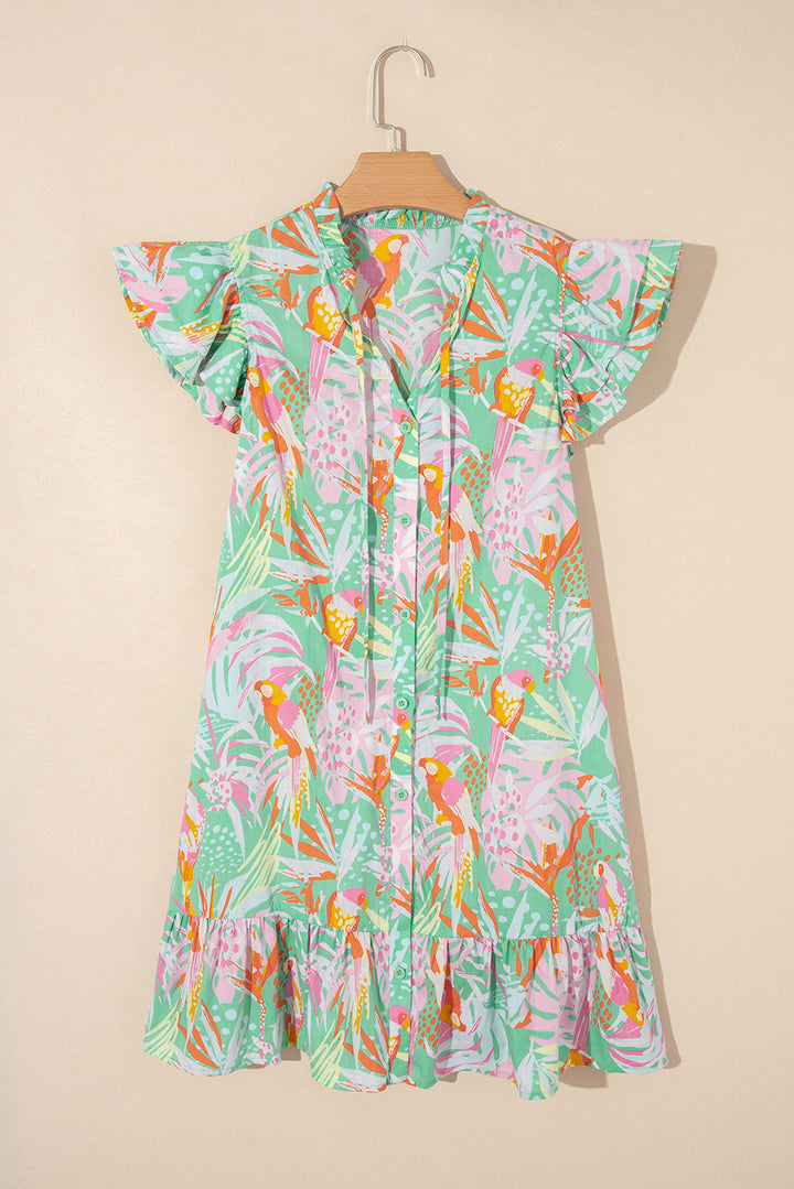 Green Abstract Floral Ruffle Trim Flutter Sleeve Buttoned Dress