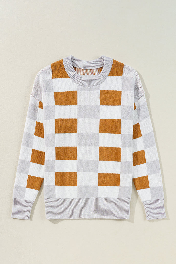 Checkered Ribbed Edge O Neck Drop Shoulder Sweater