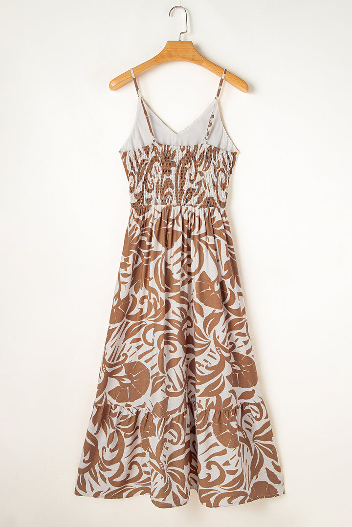 Khaki Floral Shirred High Waist Spaghetti Straps Maxi Dress