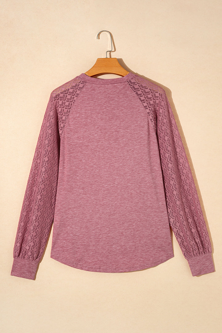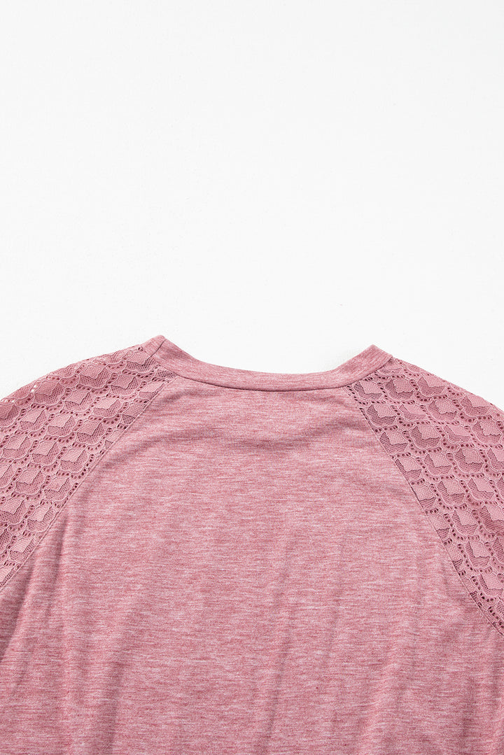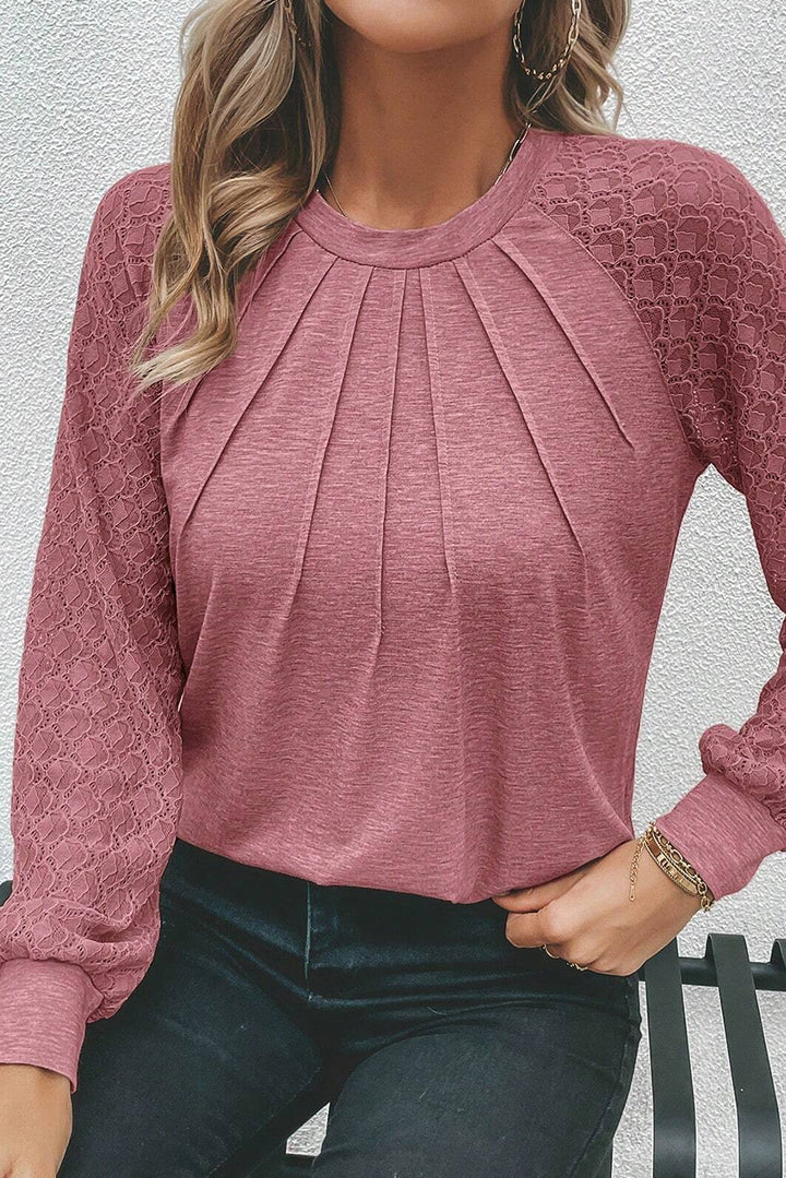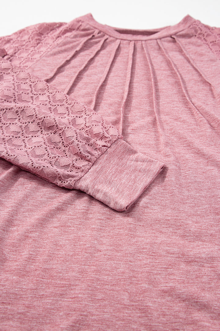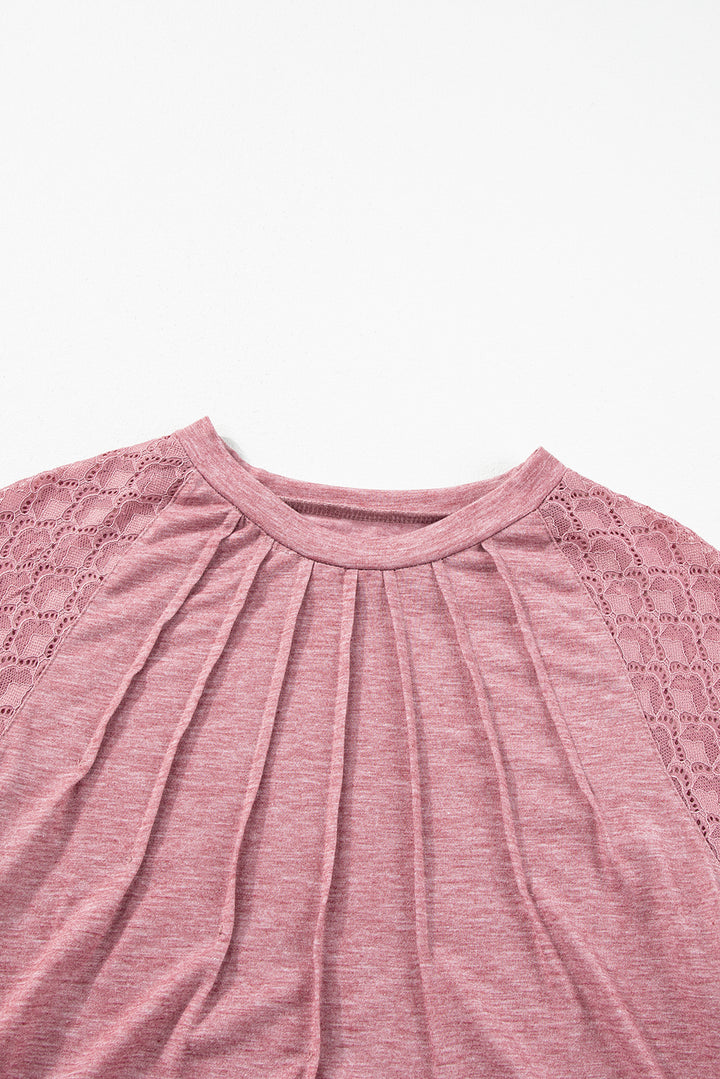 Contrast Lace Raglan Sleeve Plicate Round Neck Top