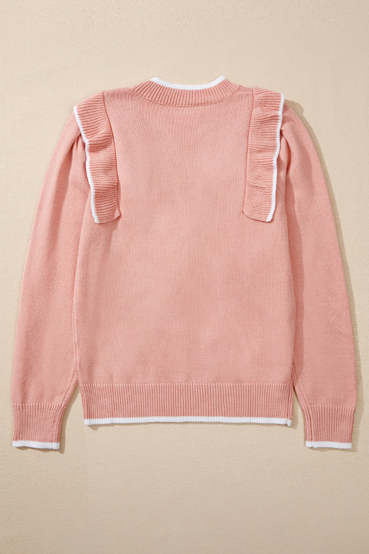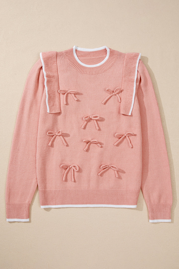 Ruffled Bowknot Ribbed Trim Long Sleeve Sweater