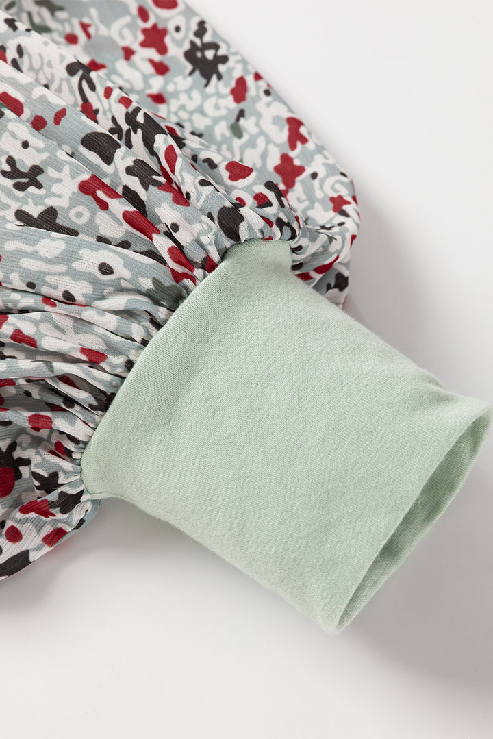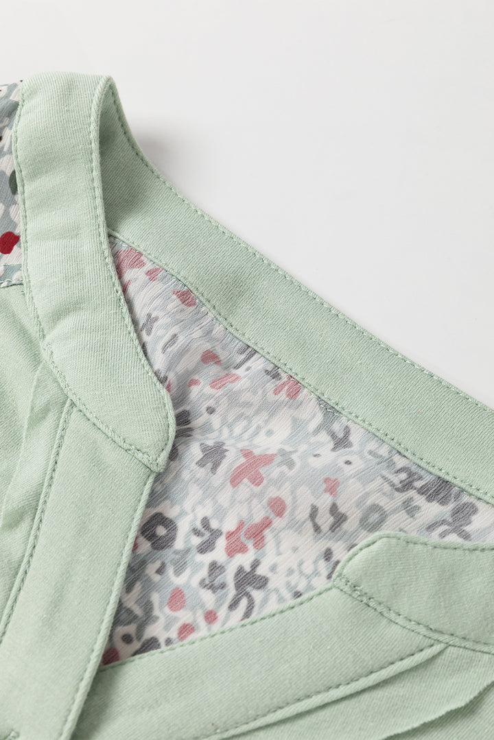 Contrast Printed Bubble Sleeve Henley Loose Top with Slits