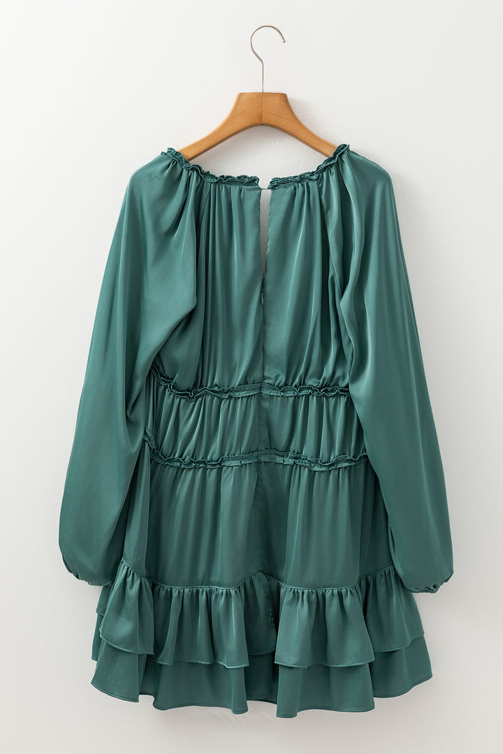 Mist Green Tiered Ruffled Puff Sleeve Loose Fit Mini Dress