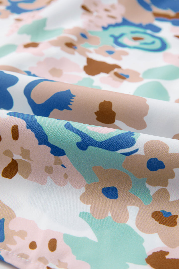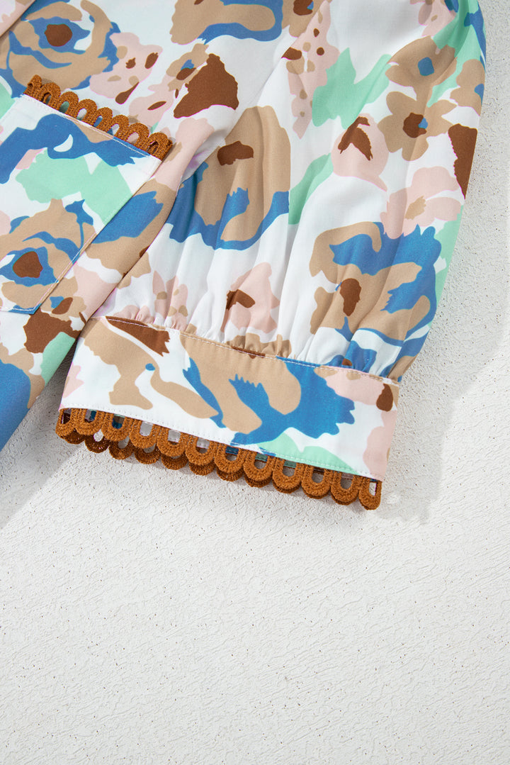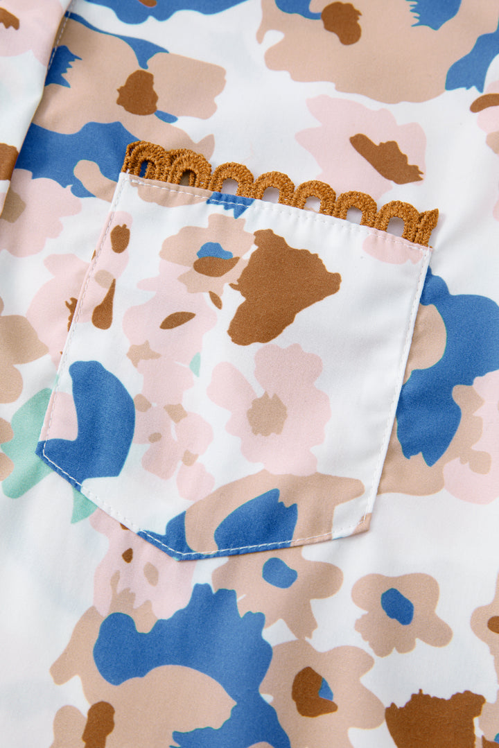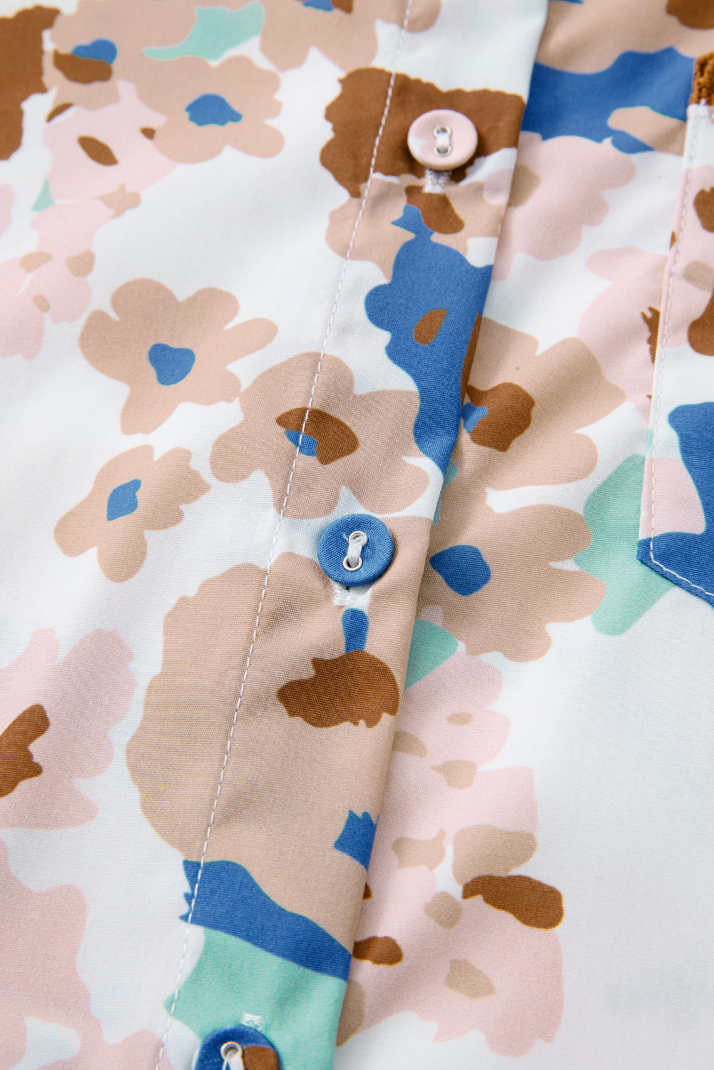 Multicolour Floral Print Ricrac Trim Collared Puff Short Sleeve Shirt