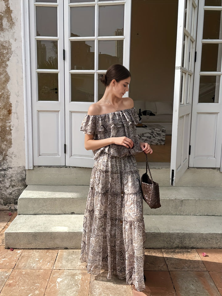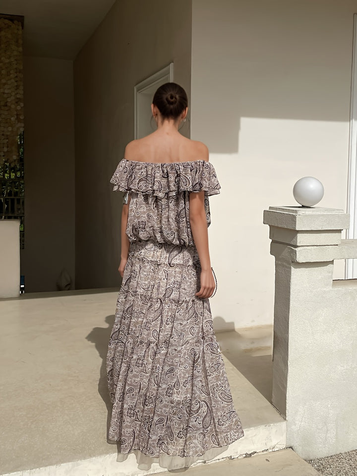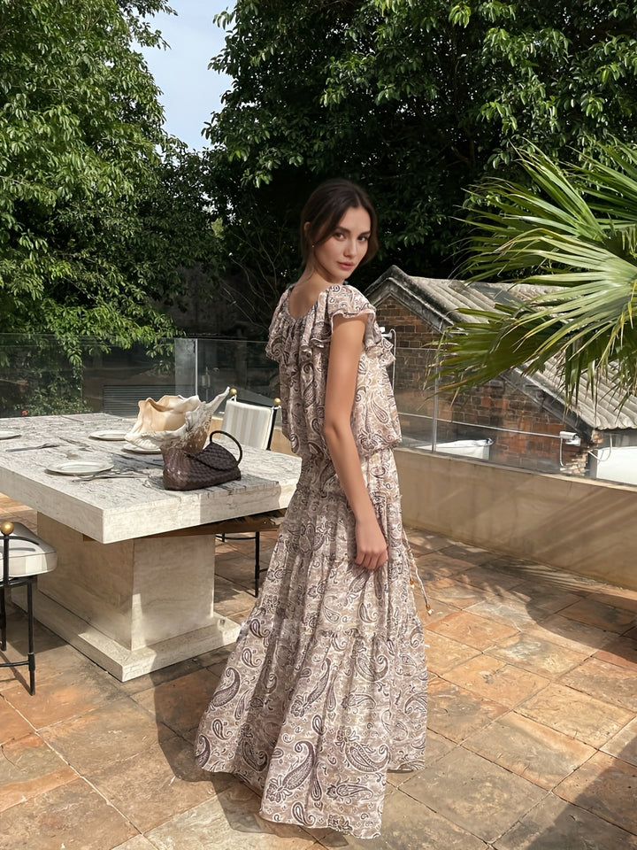 Boasting an intricate paisley motif for bohemian flair, this top features a flattering V-neckline secured by a self-tie closure for customizable fit.