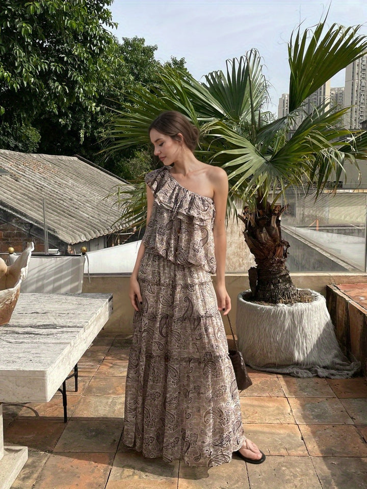 Delicate ruffles cascade along the hem, adding feminine movement and texture.