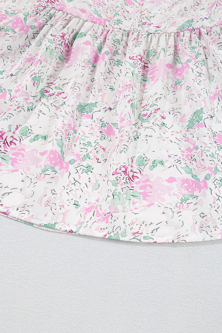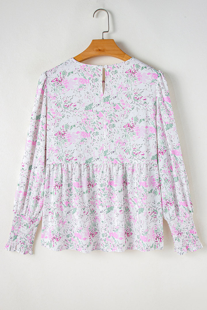 Pink Floral Print Shirred Balloon Sleeve Keyhole Back Babydoll Blouse
