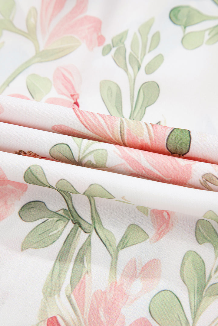 Pink Floral Print Striped Contrast Tiered Ruffled Sleeve V Neck Blouse