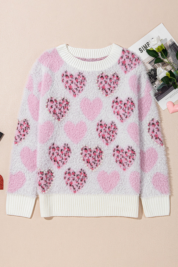Heart Leopard Print Pearled Ribbed Trim Fuzzy Sweater
