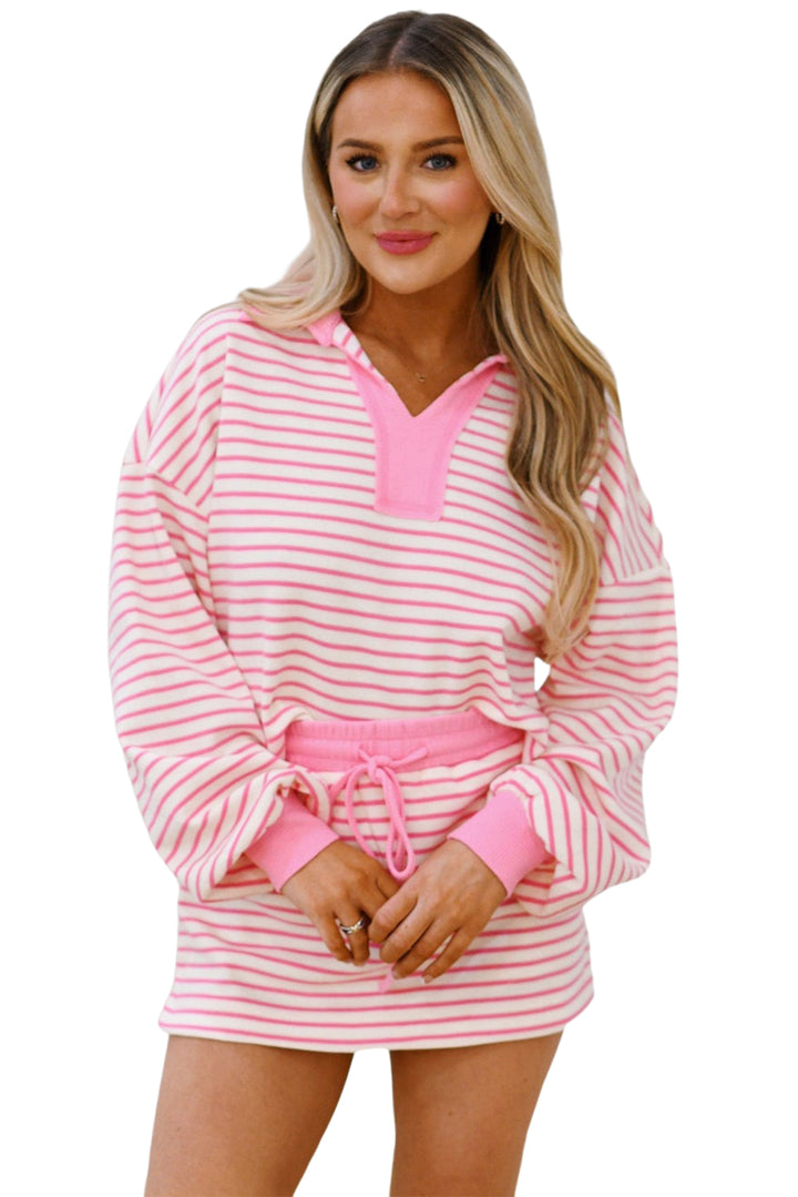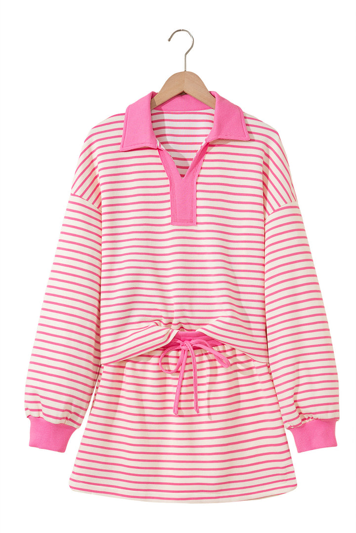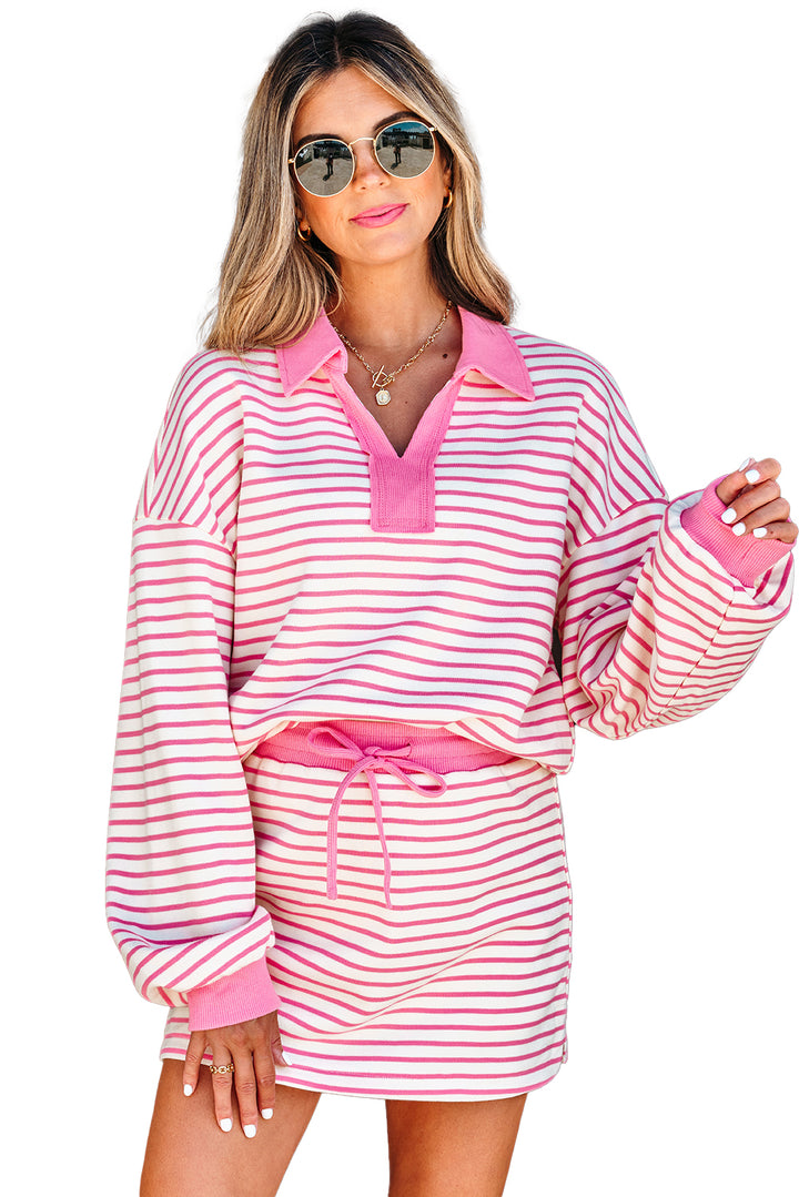 Pink Stripe Collared V Neck Drop Shoulder Pullover and Skort 2pcs Outfit