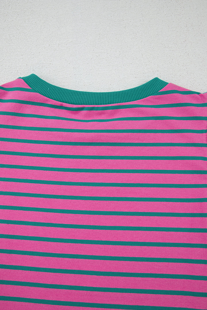 Pink Stripe Colorblock Ruffled Sleeve Crew Neck Blouse