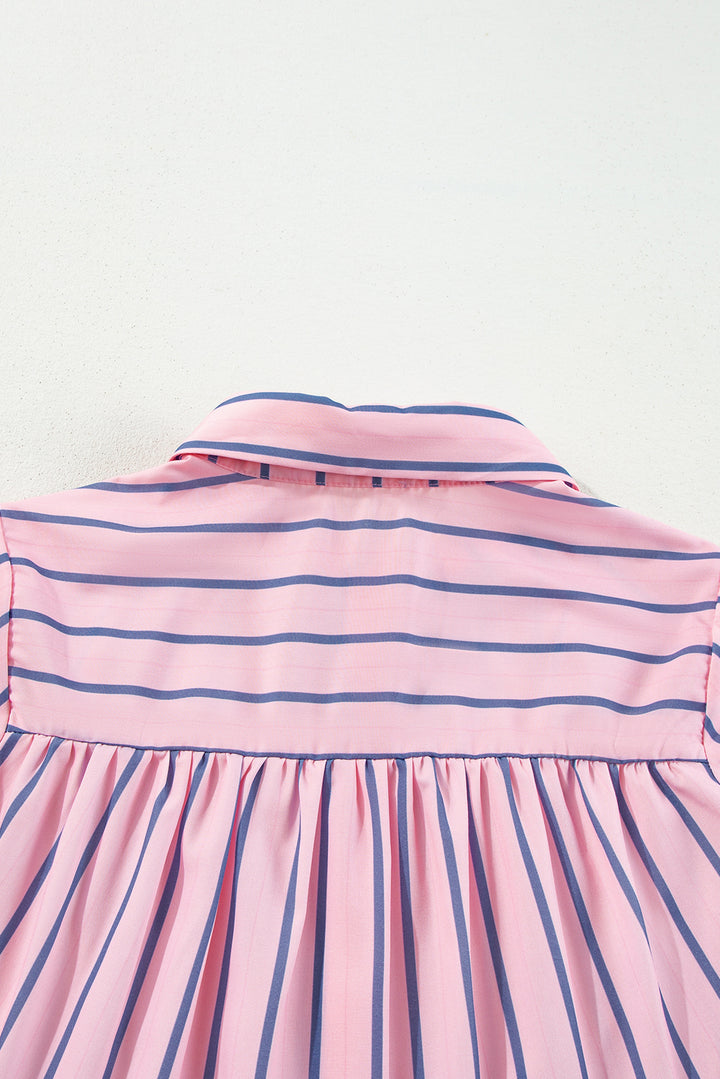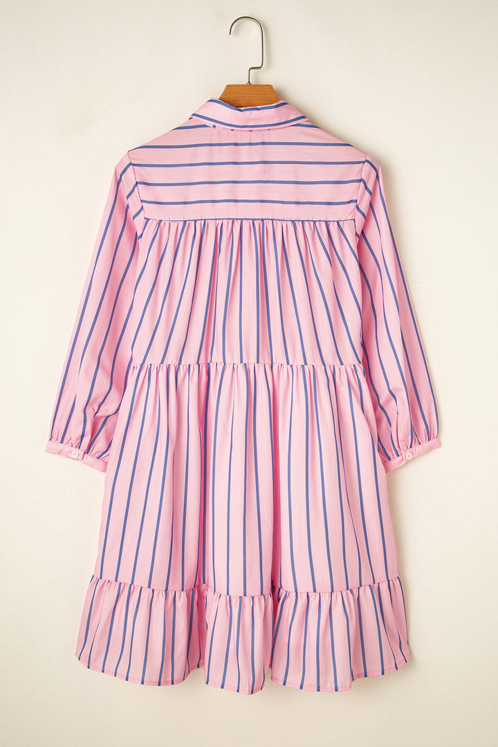 Pink Stripe Ruffled Hem Button-up Collared Shirt Mini Dress