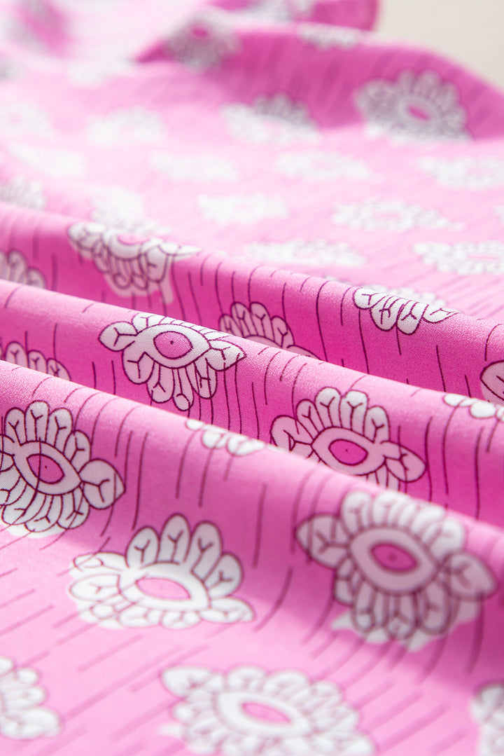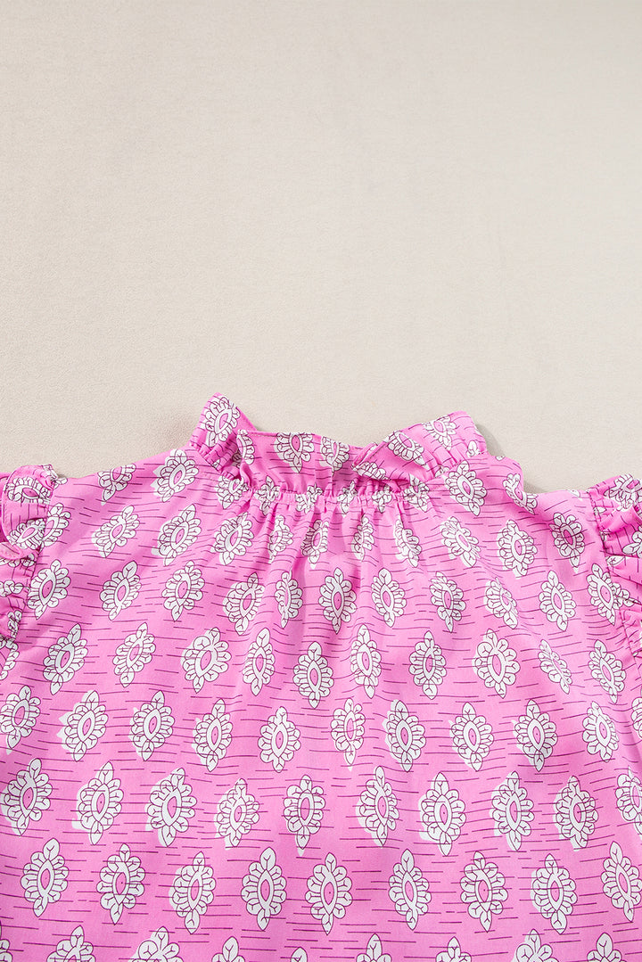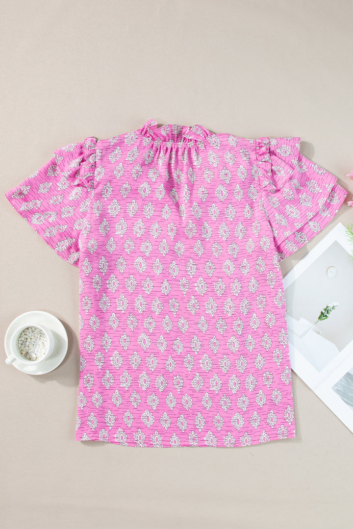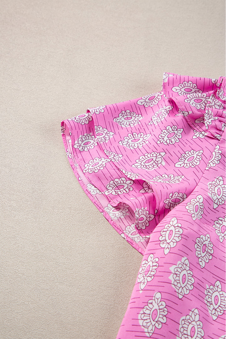 Pink Vintage Floral Ruffled Split Neck Short Sleeve Blouse