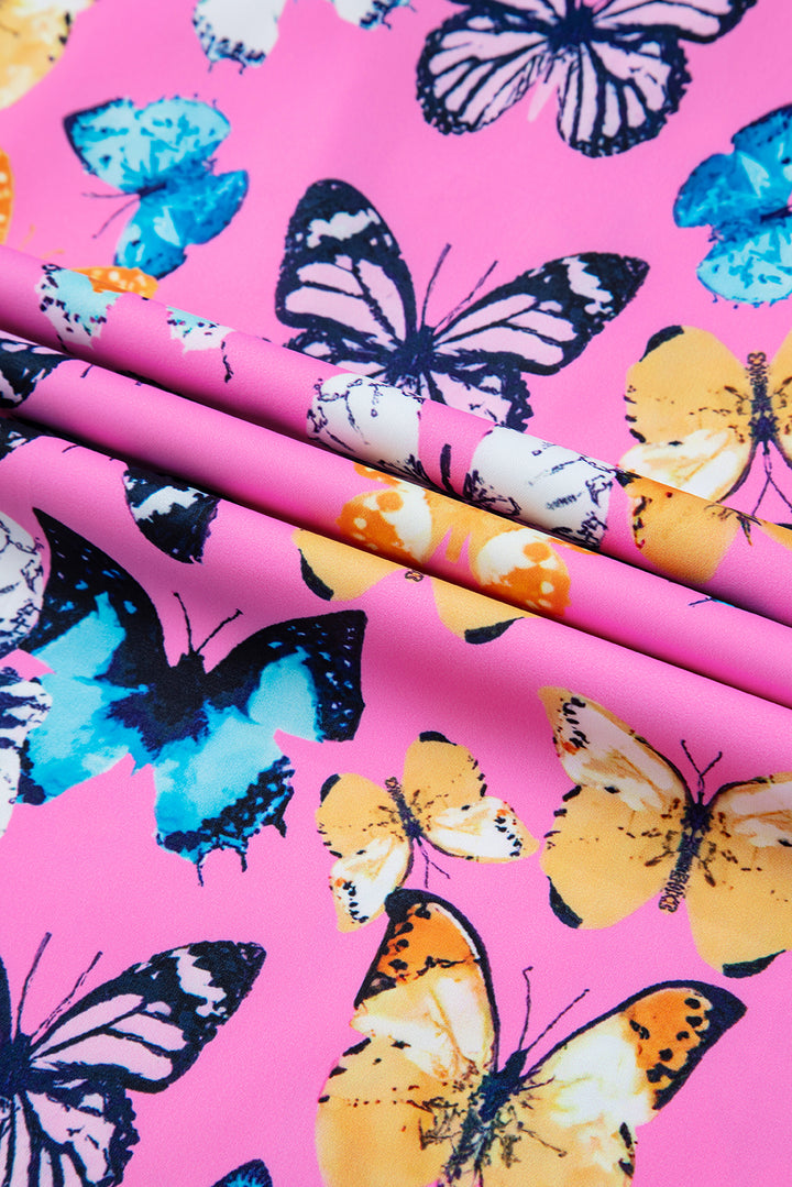 Purple Butterfly Print Ruffled Puff Sleeve Tied V Neck Blouse