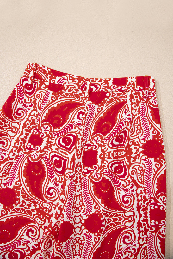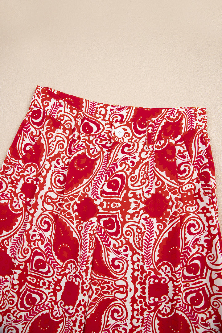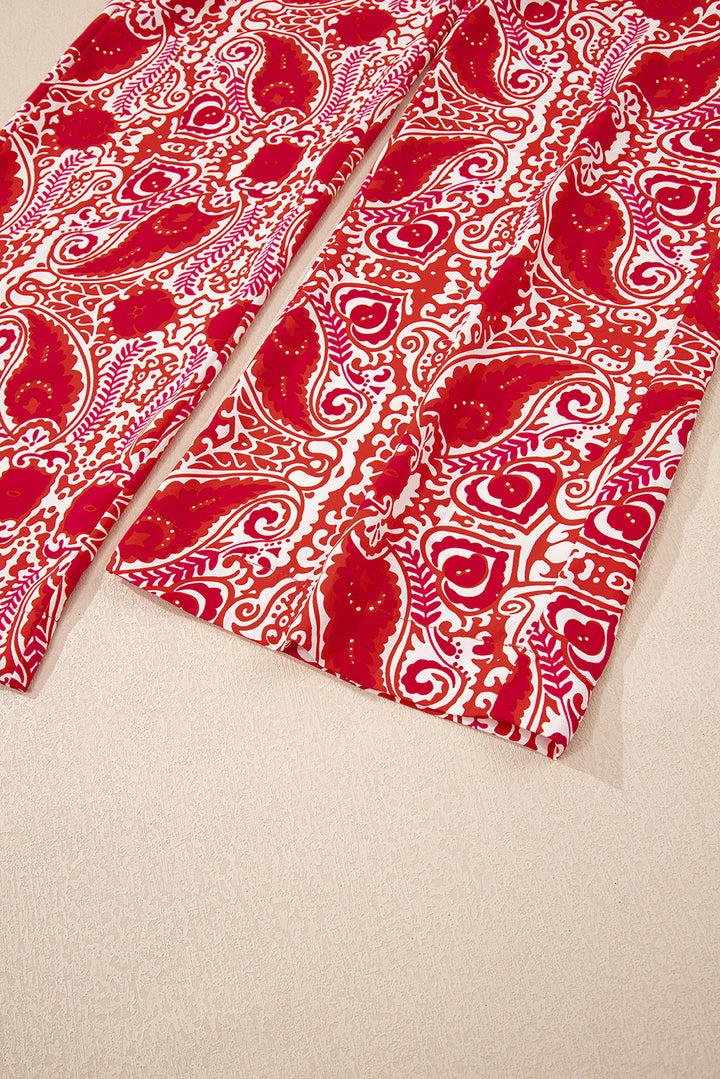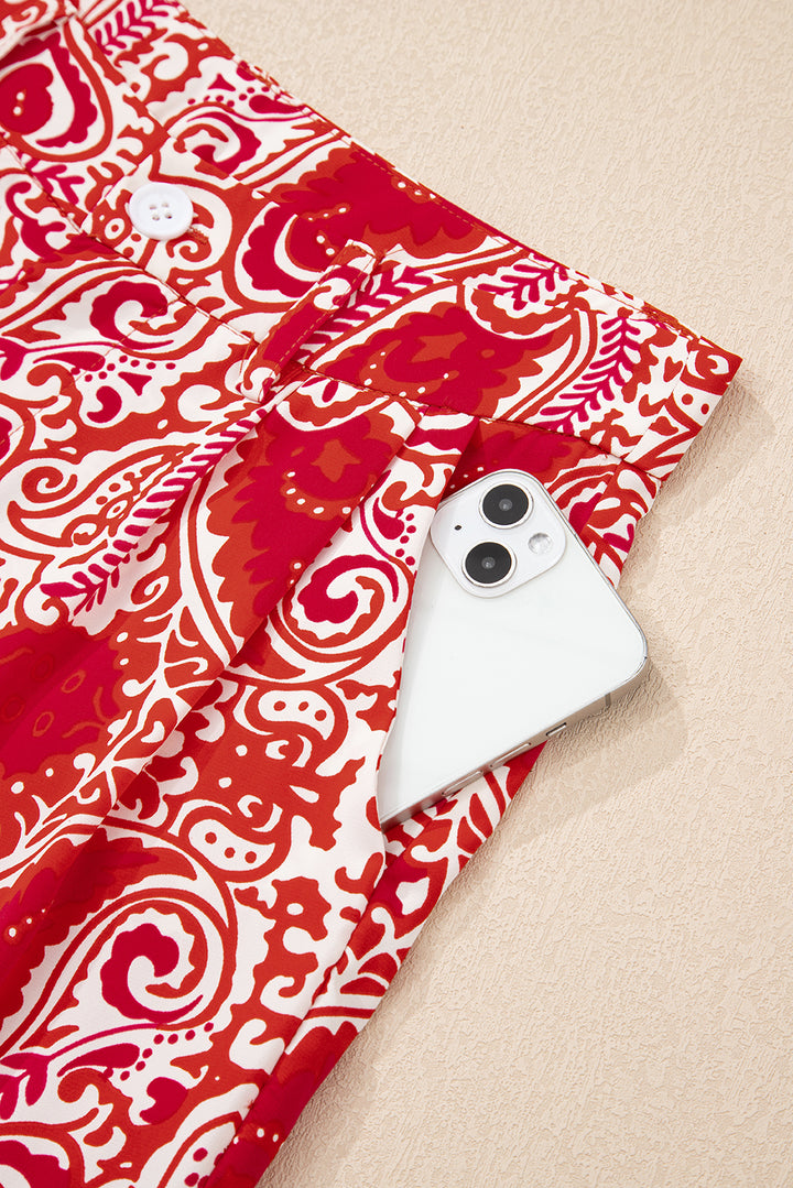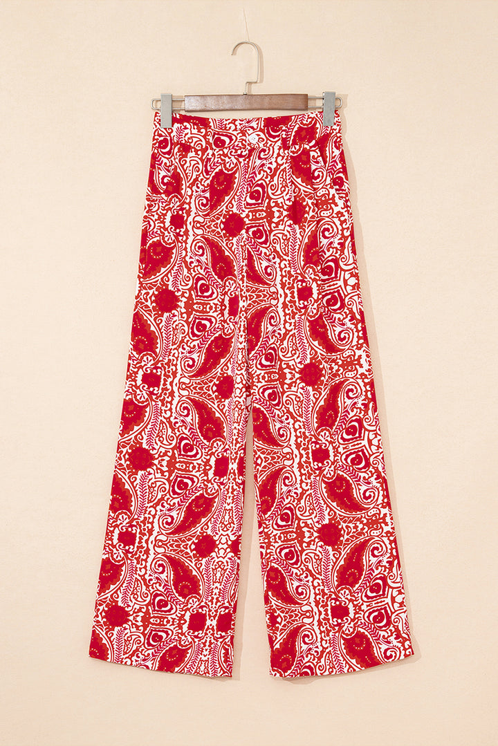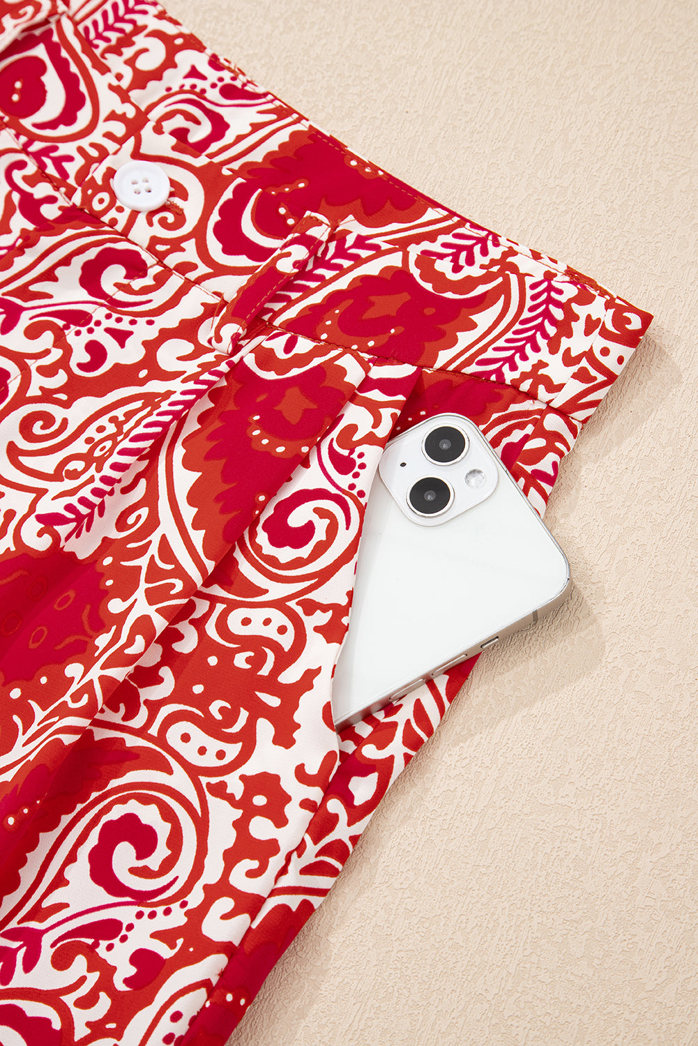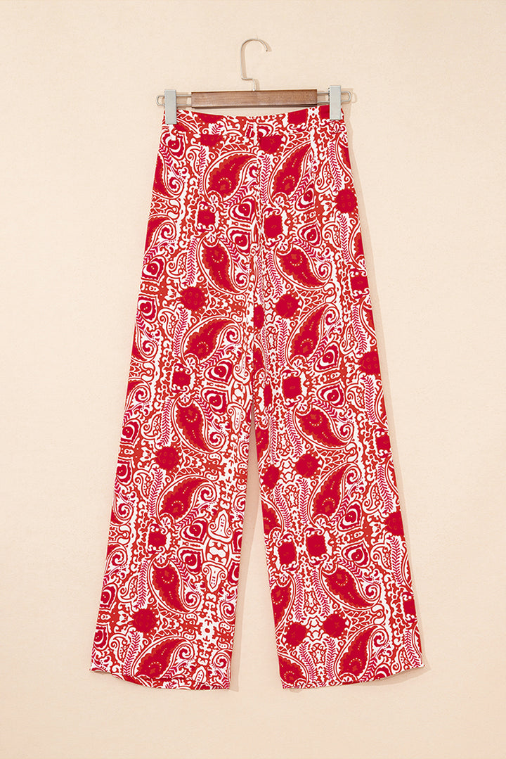 Red Paisley Printed Buttoned High Waist Straight Leg Pants
