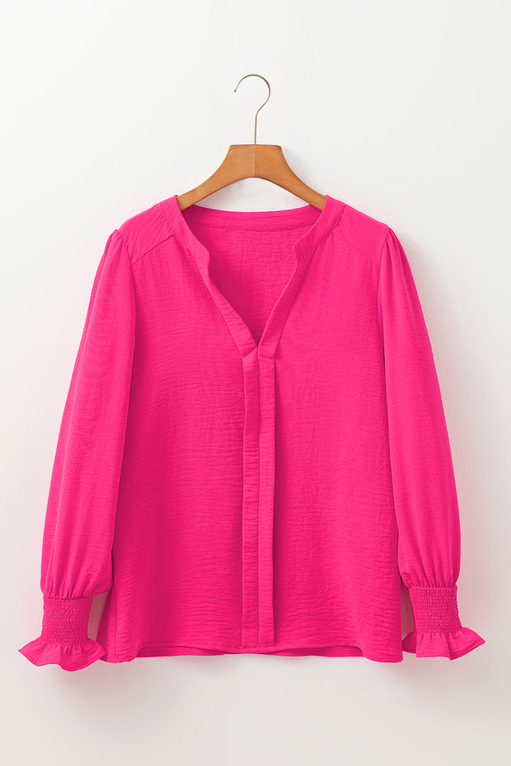 Rose Red Solid Color Shirred Cuff Notch V Neck Blouse