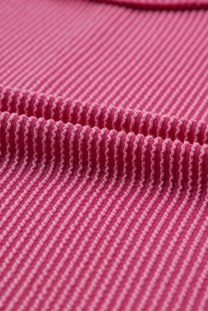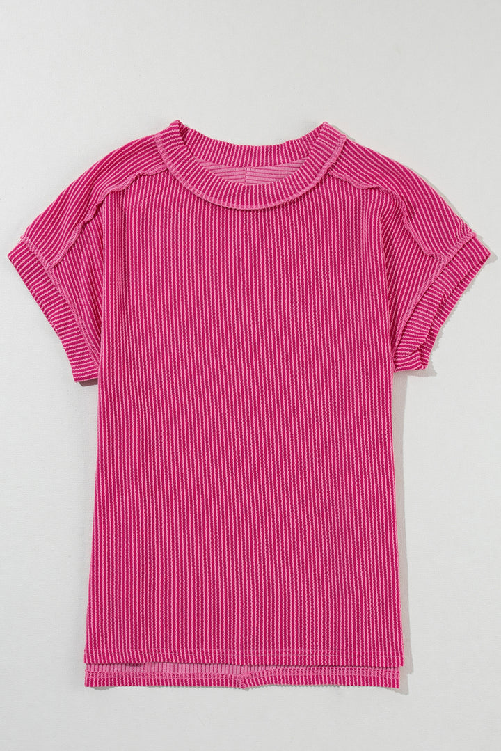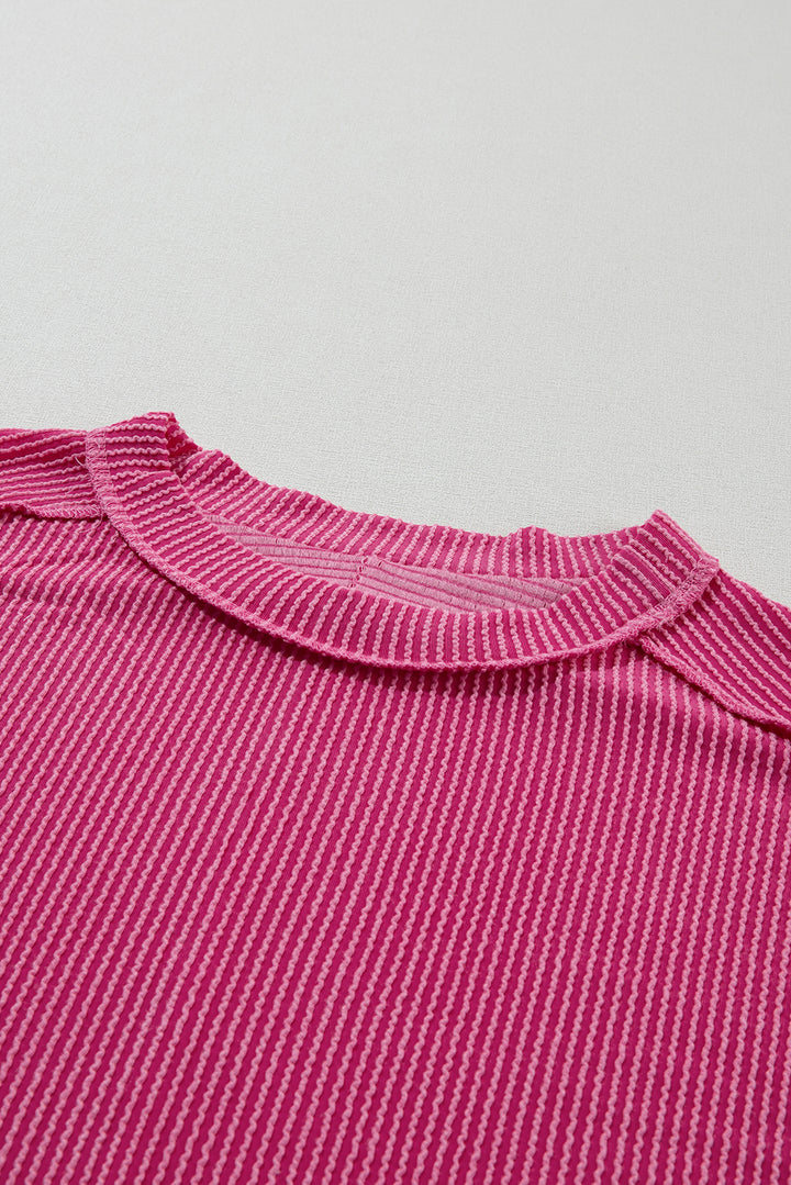 Rose Red Textured Knit Exposed Stitching T-shirt