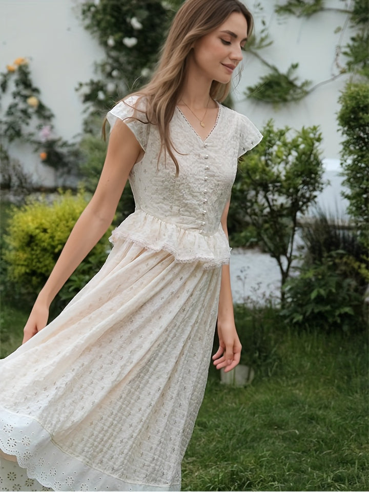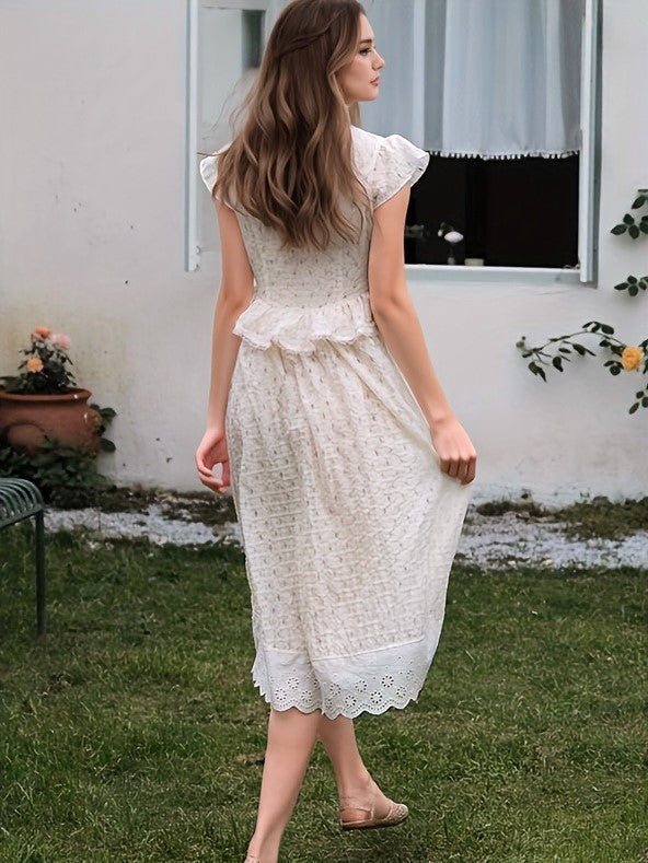 Ruffle Lace Contrast V Neck Flutter Sleeve Midi Dress