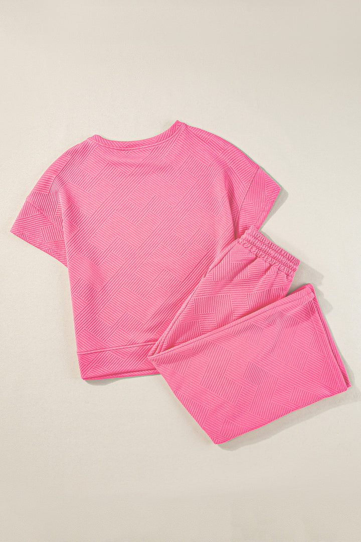 Strawberry Pink Textured Loose Fit T Shirt and Drawstring Pants Set